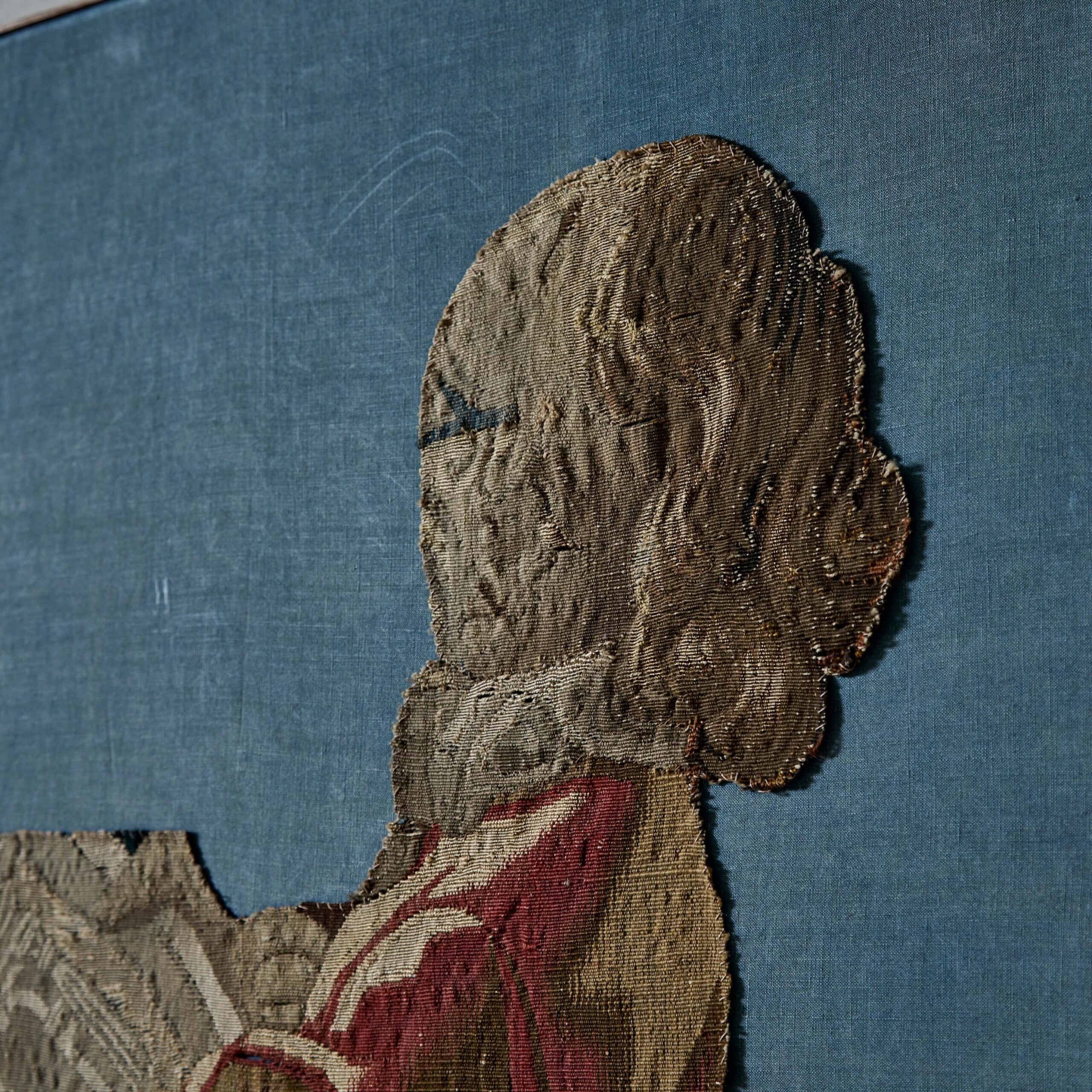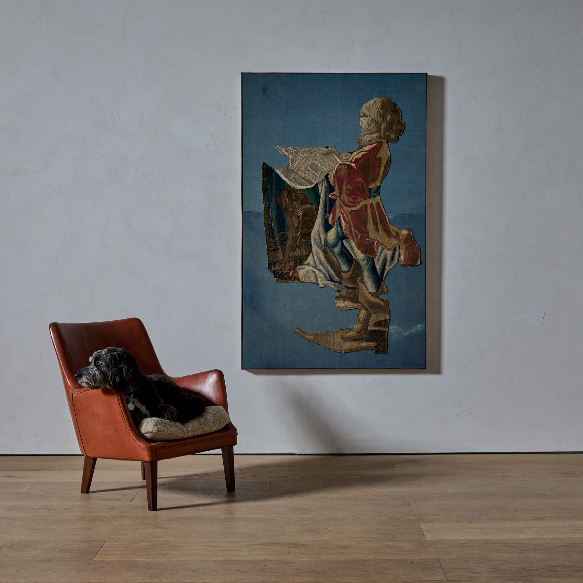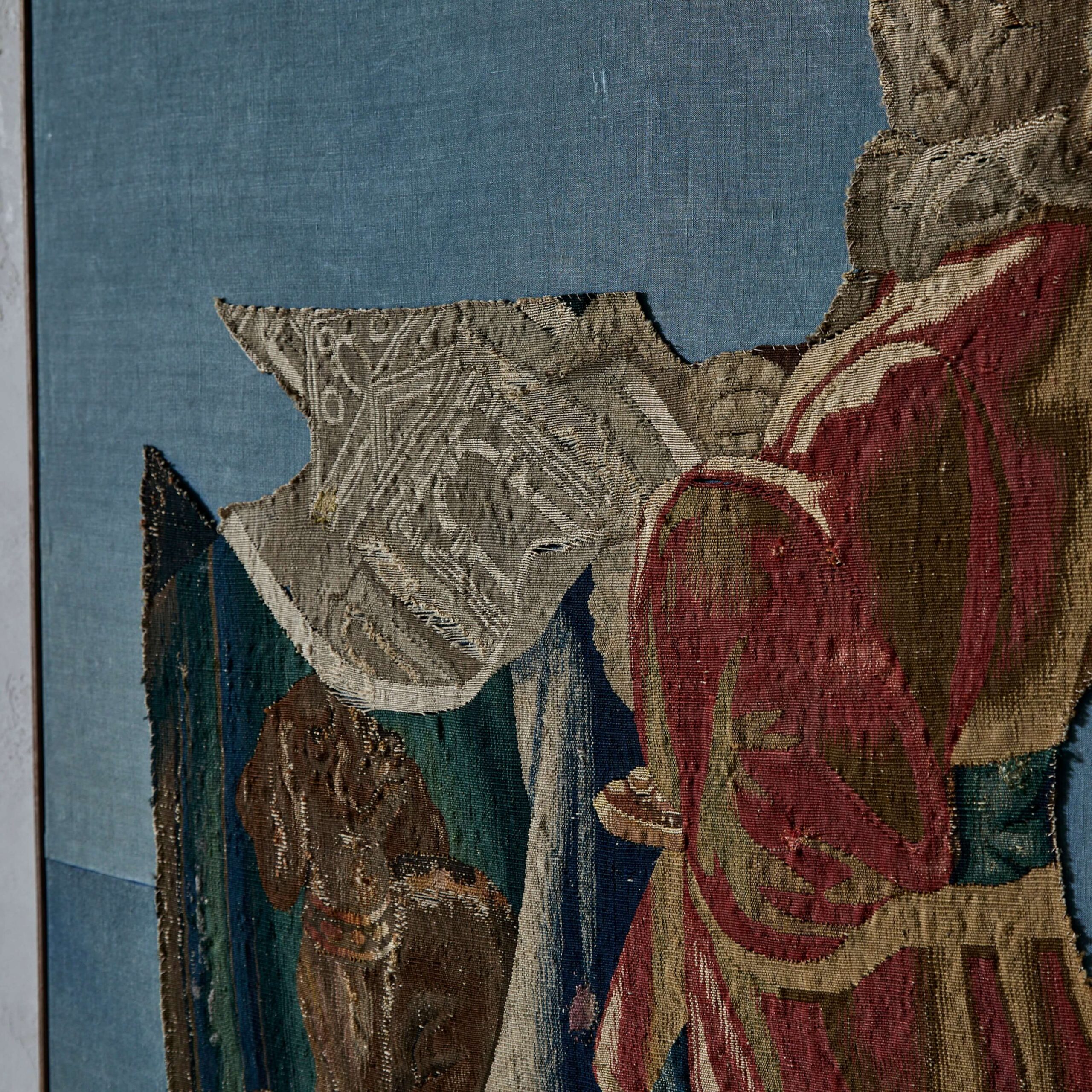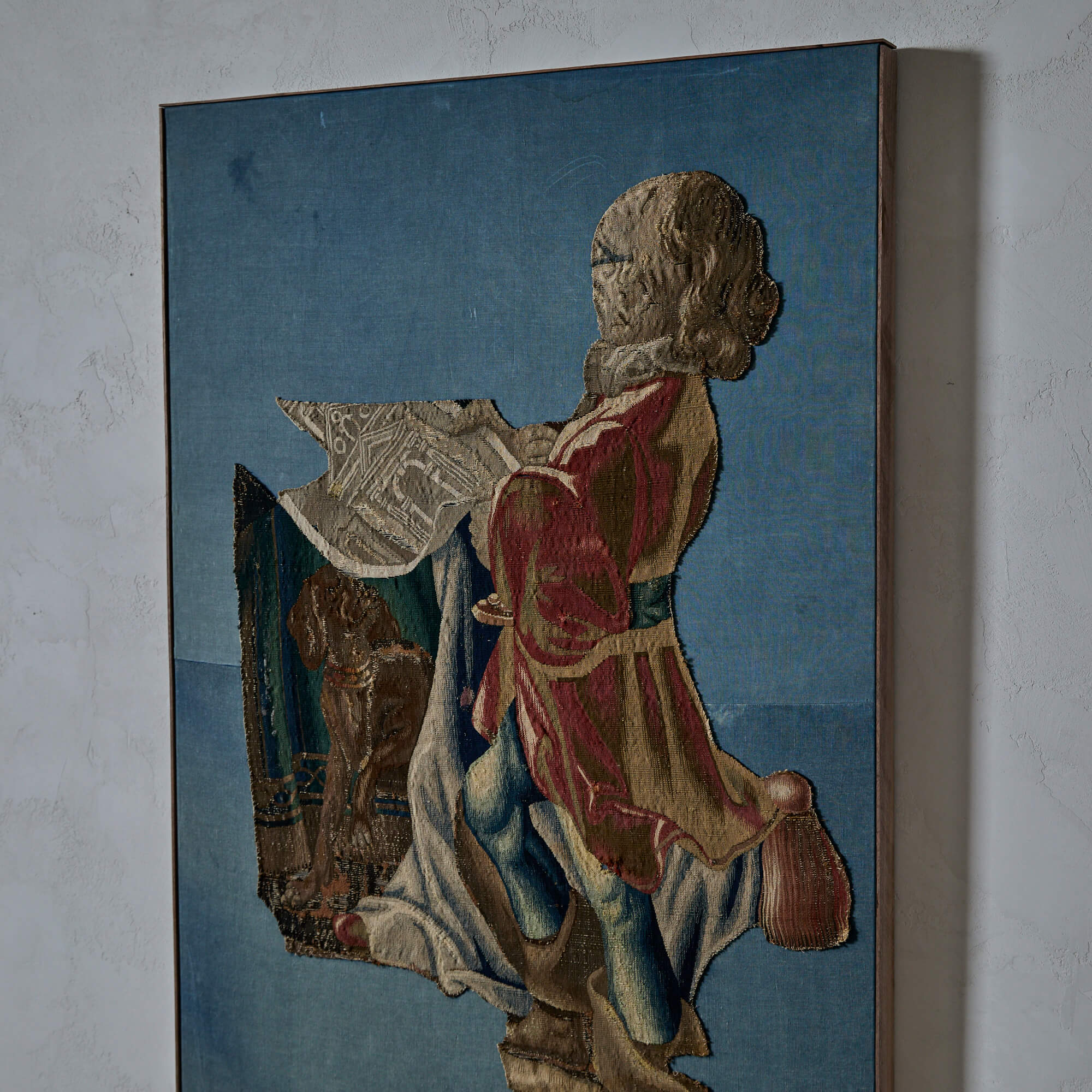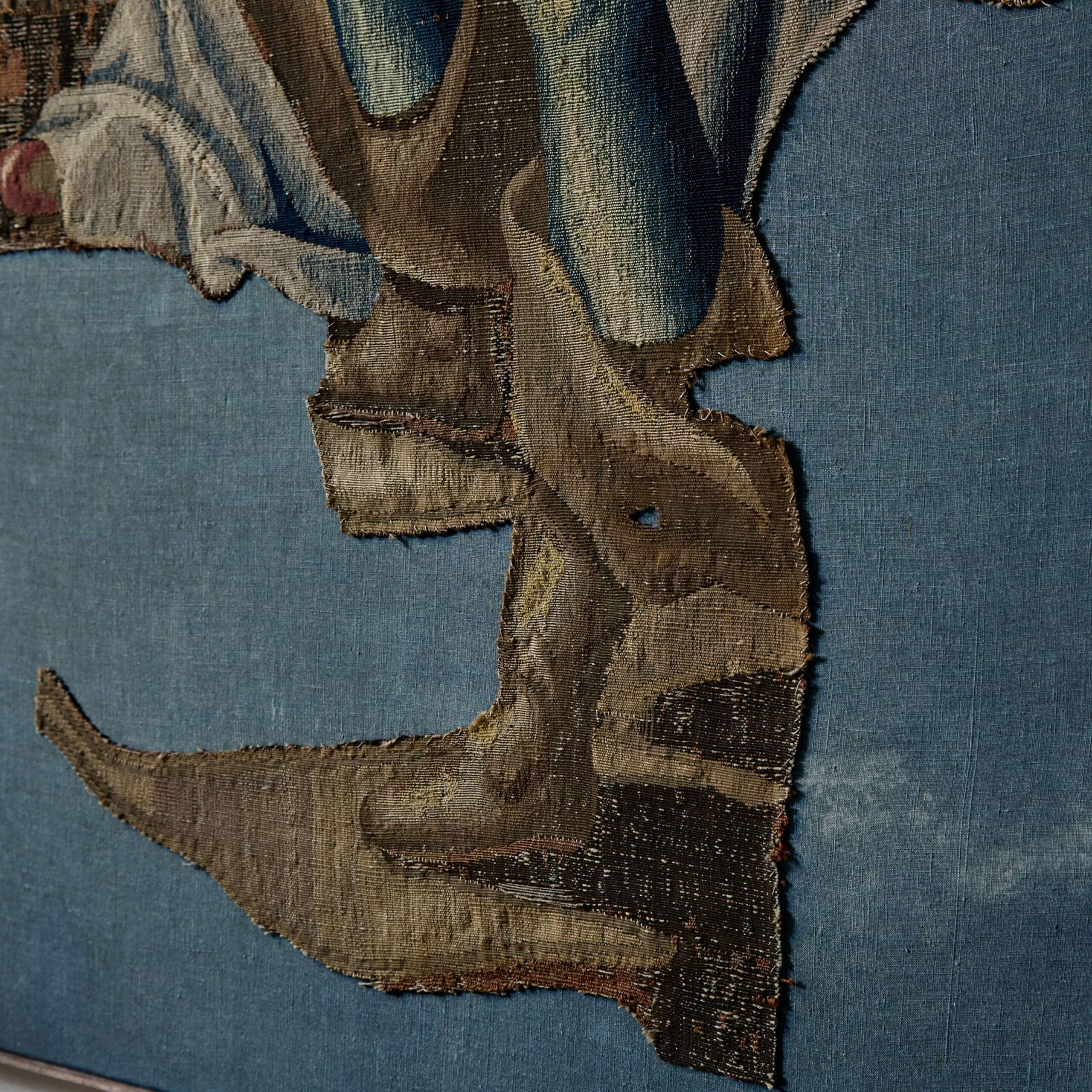 A Tapestry Fragment of a Standing Gentleman with a Dog and a Plan