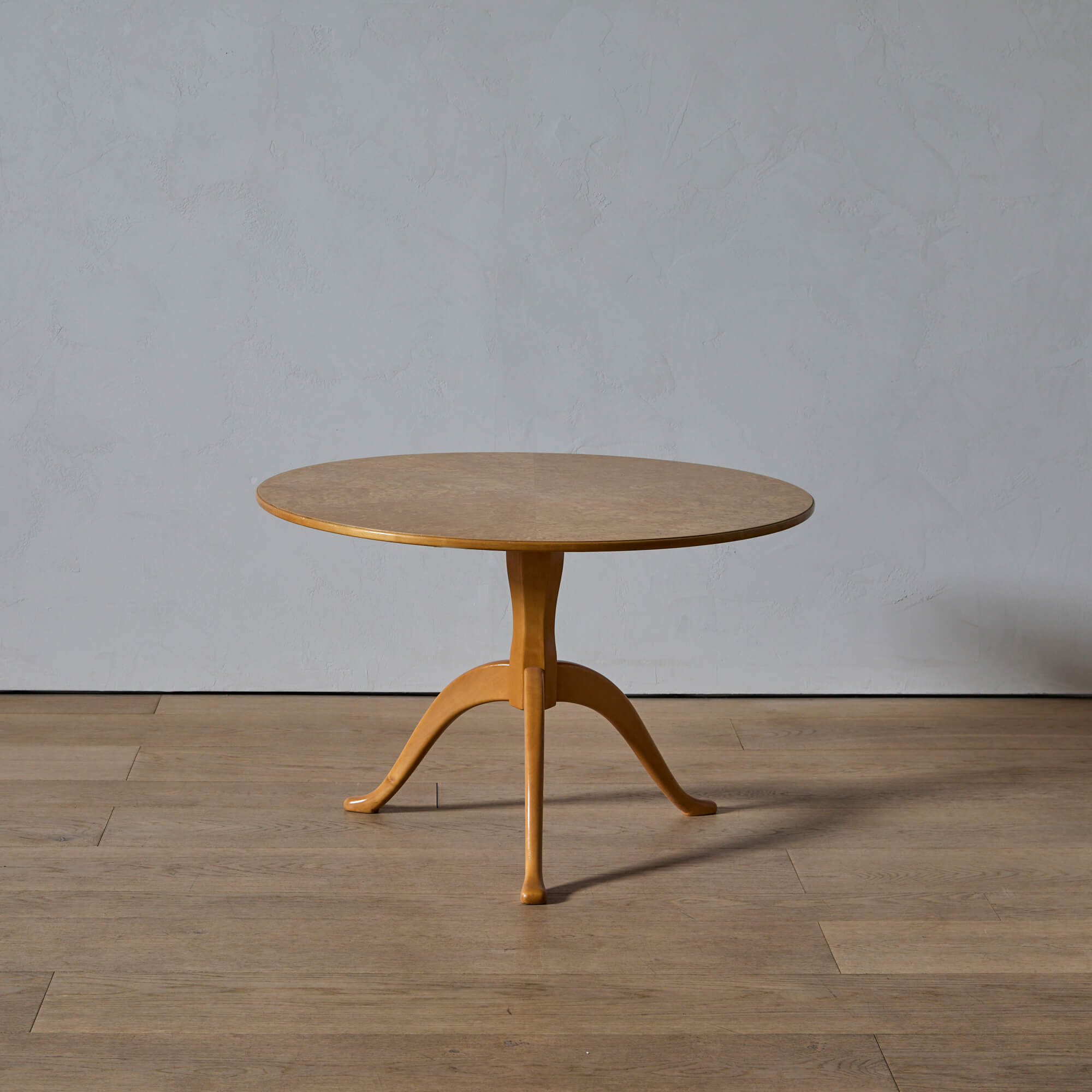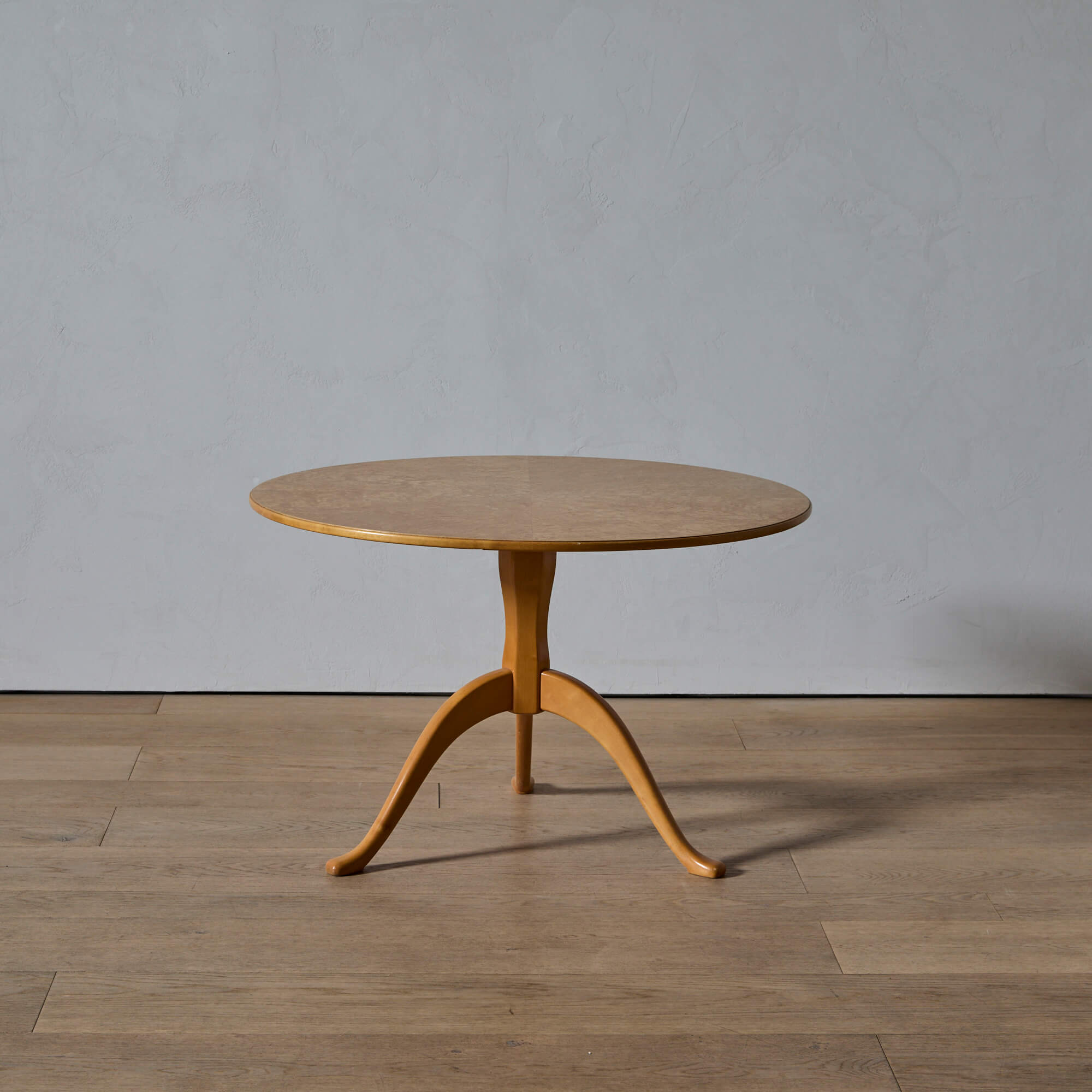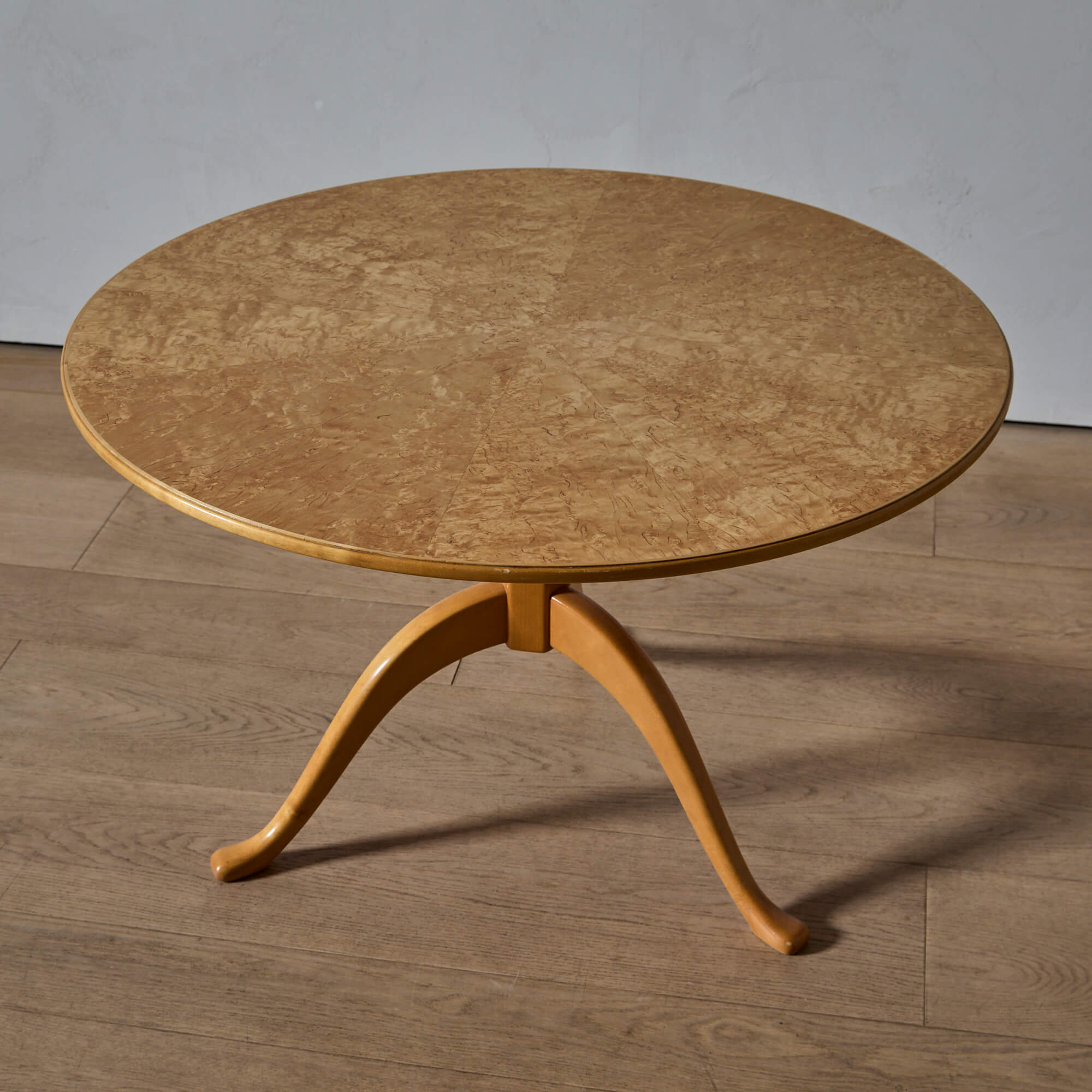 A graceful center table, the top in radial birch veneer, the tripod base of solid birch. Observe the subtle carving of the base. Stamped CM.