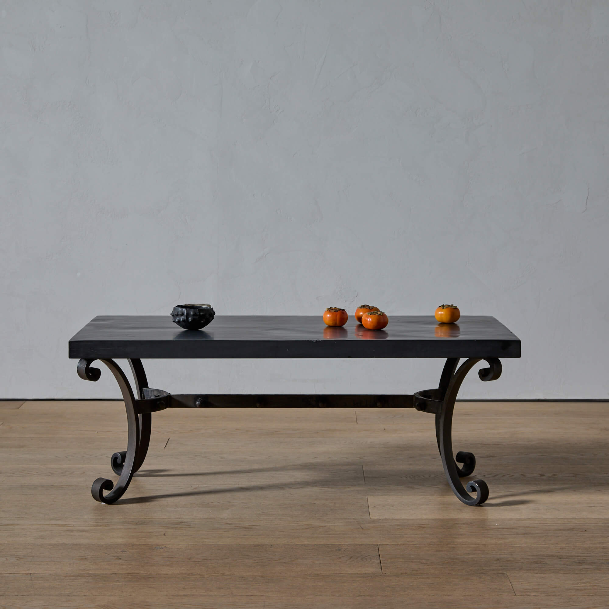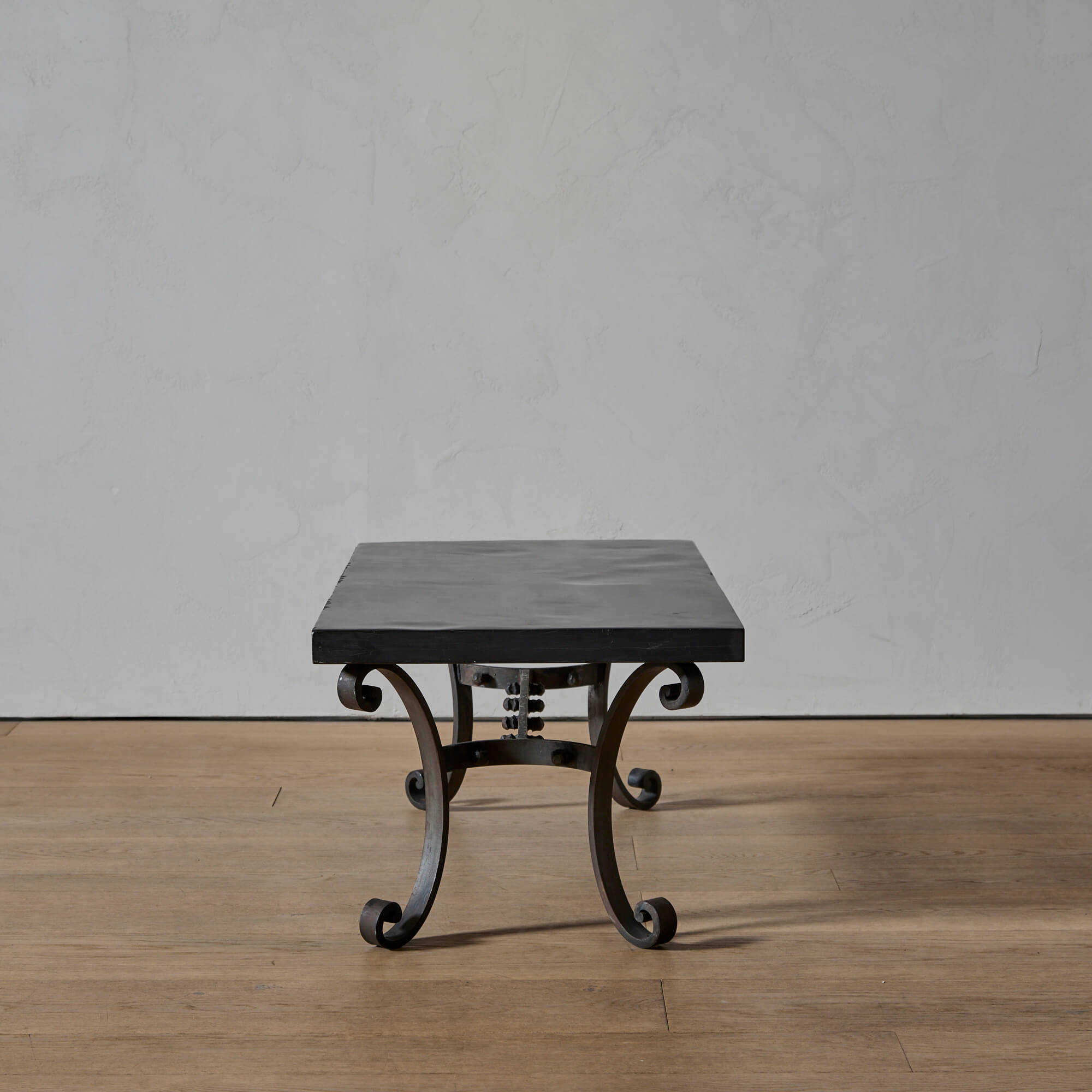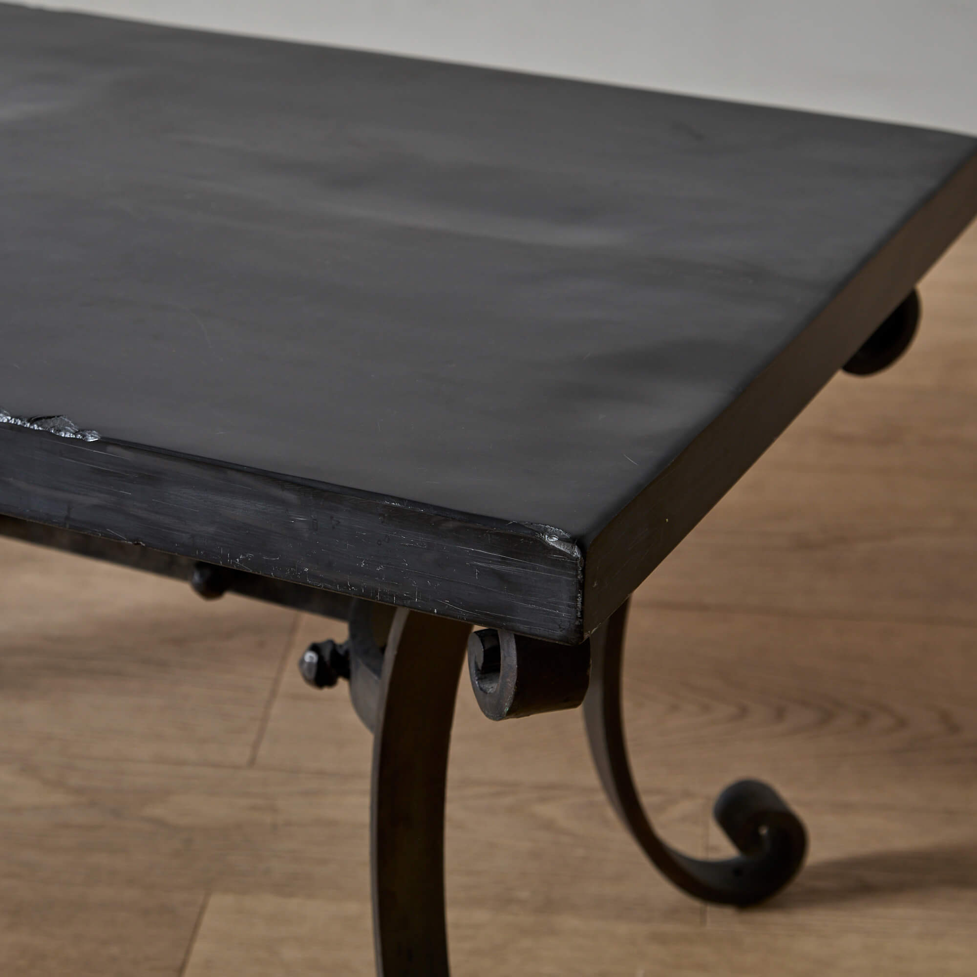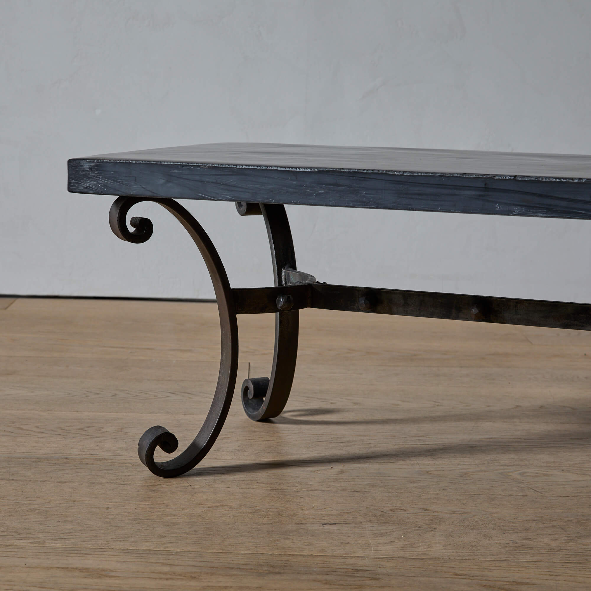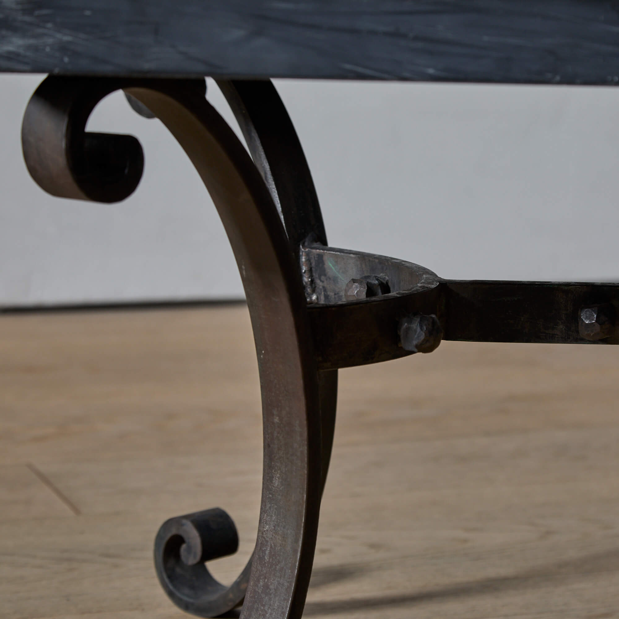A thick antique Belgian slate slab with a time-worn and subtly ungulating surface sits atop a fine wrought iron base of elegant profile. The base is mid-twentieth century, the top is eighteenth or nineteenth.