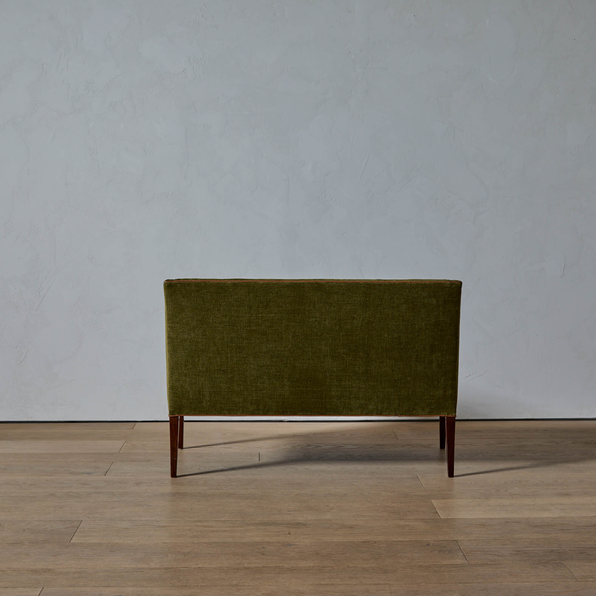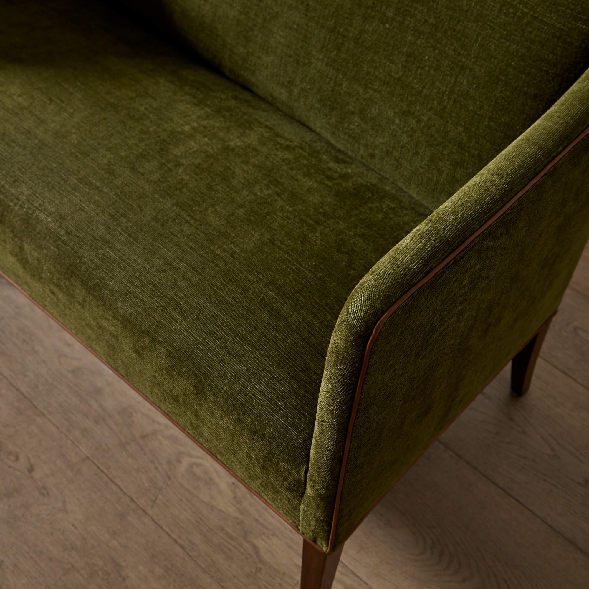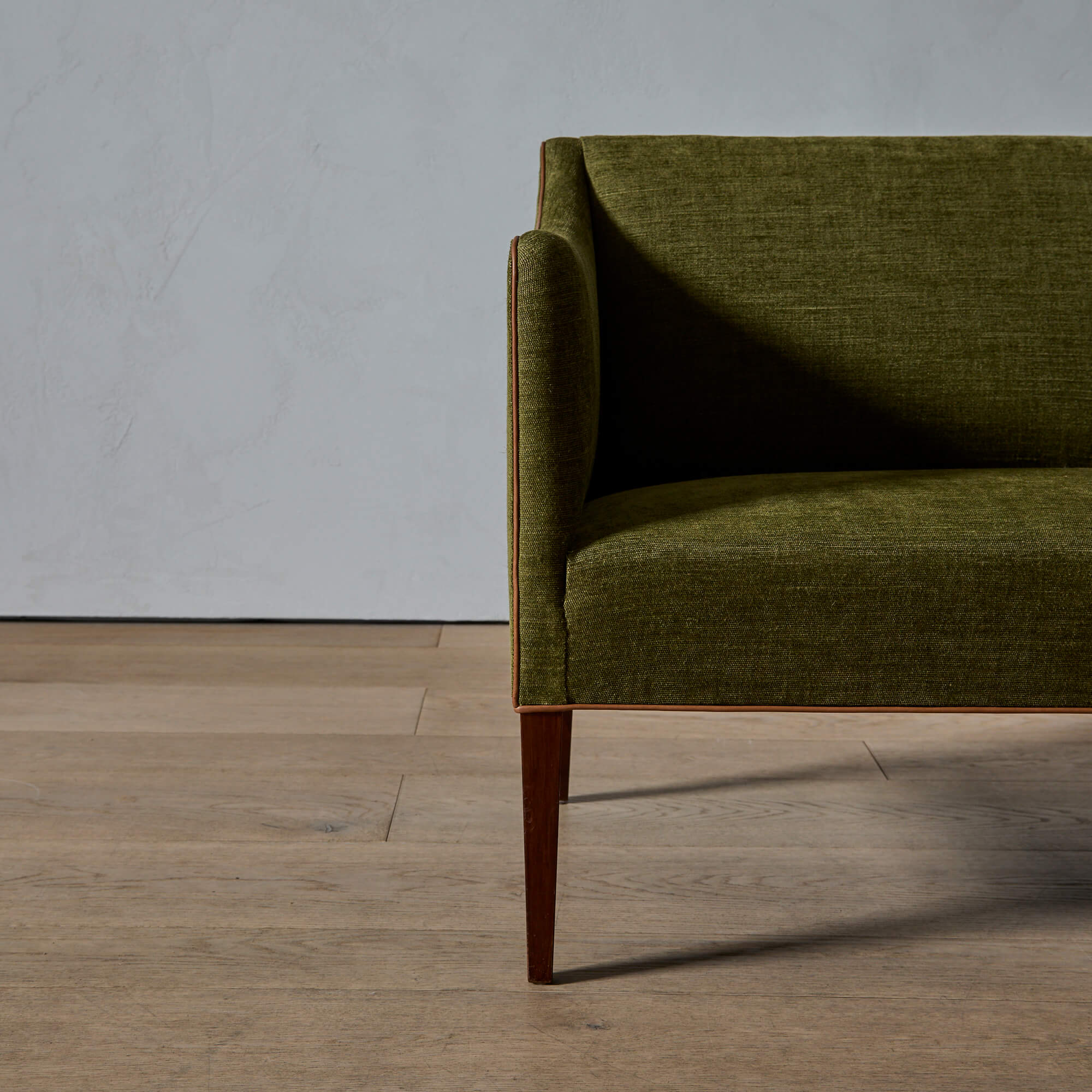 This slender settee with its subtle curves has been fully restored. The fabric is an olive linen blend by Savel, and it is welted with cognac leather.