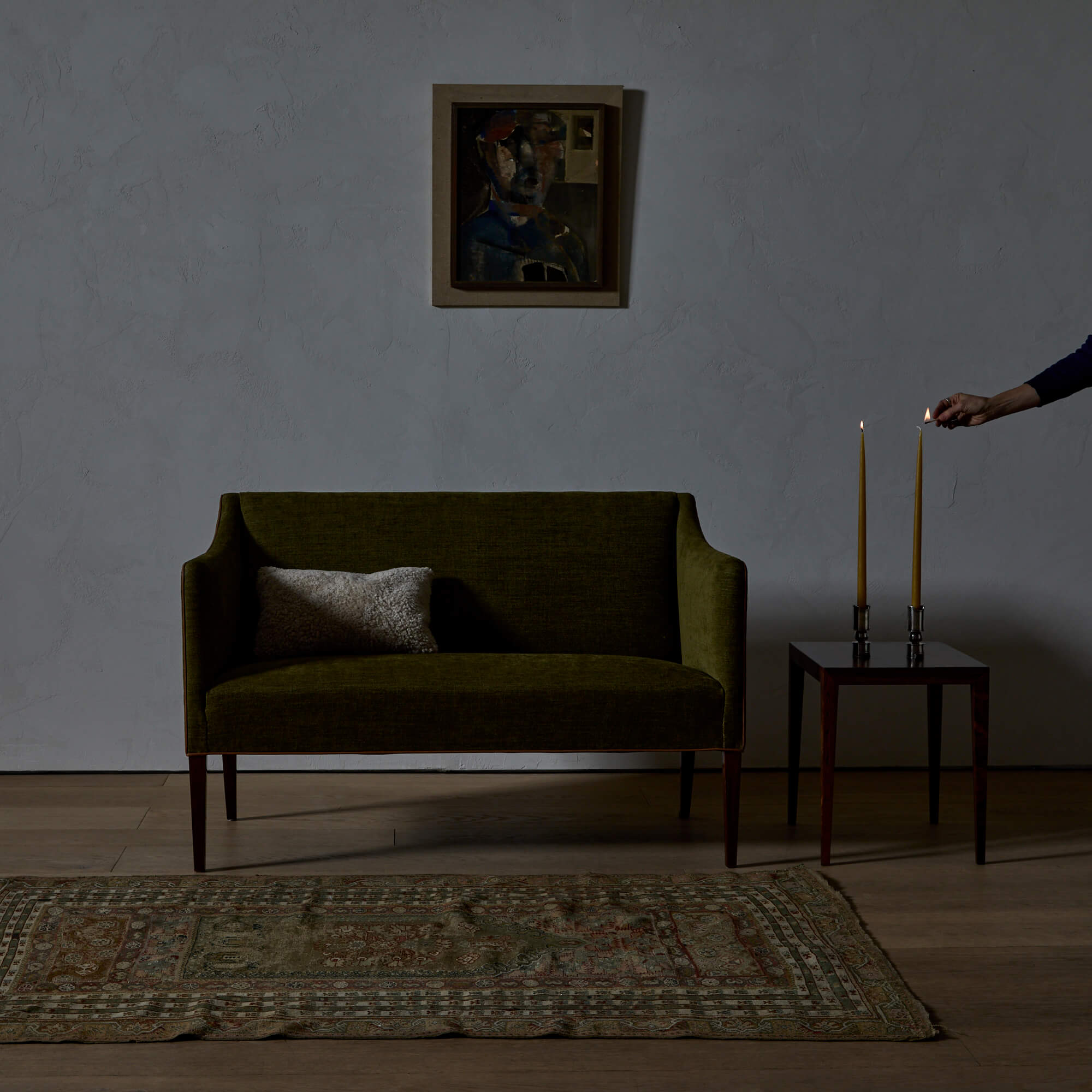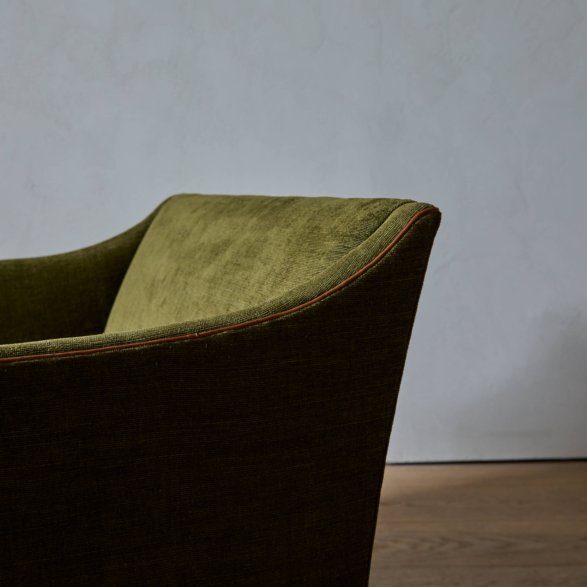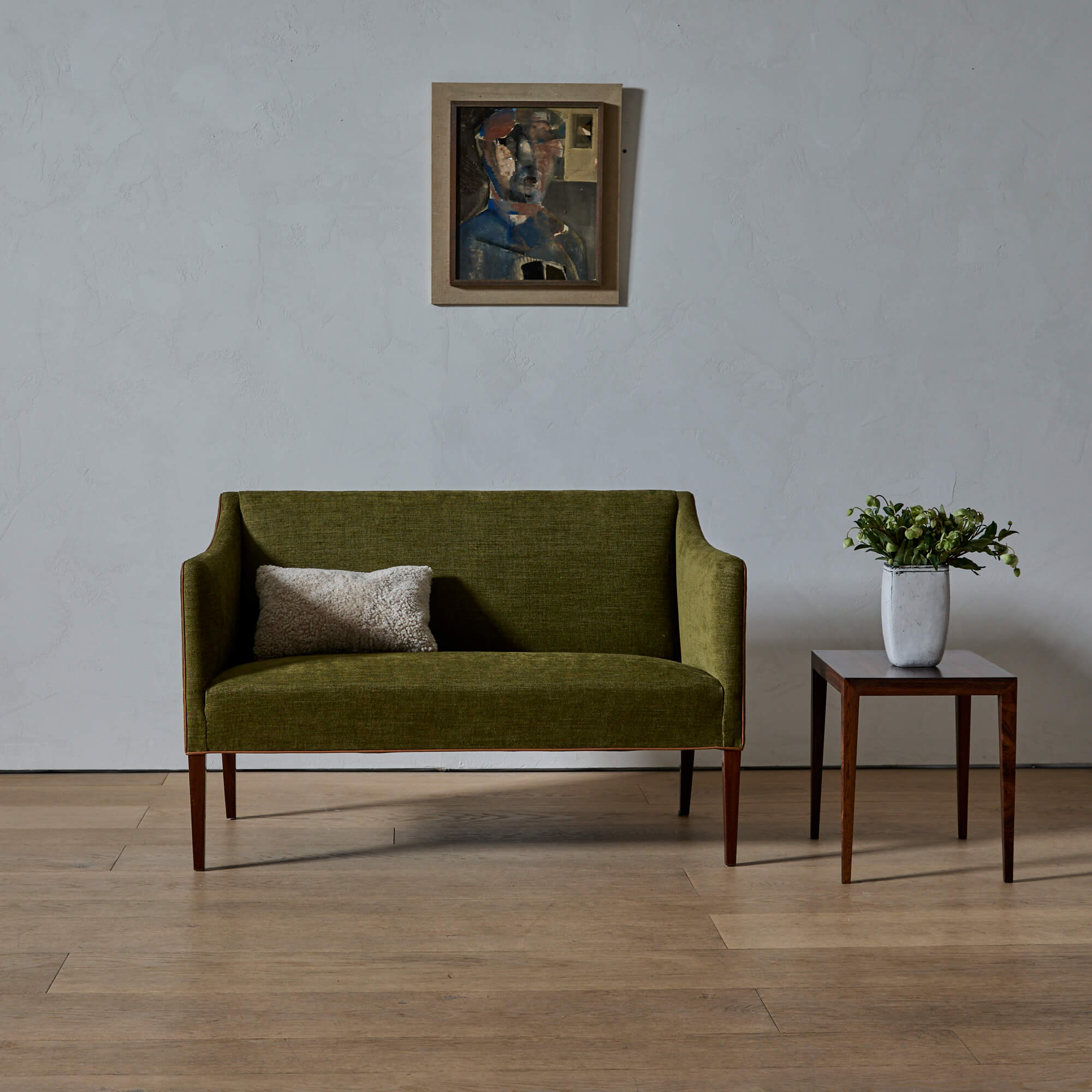 This slender settee with its subtle curves has been fully restored. The fabric is an olive linen blend by Savel, and it is welted with cognac leather.