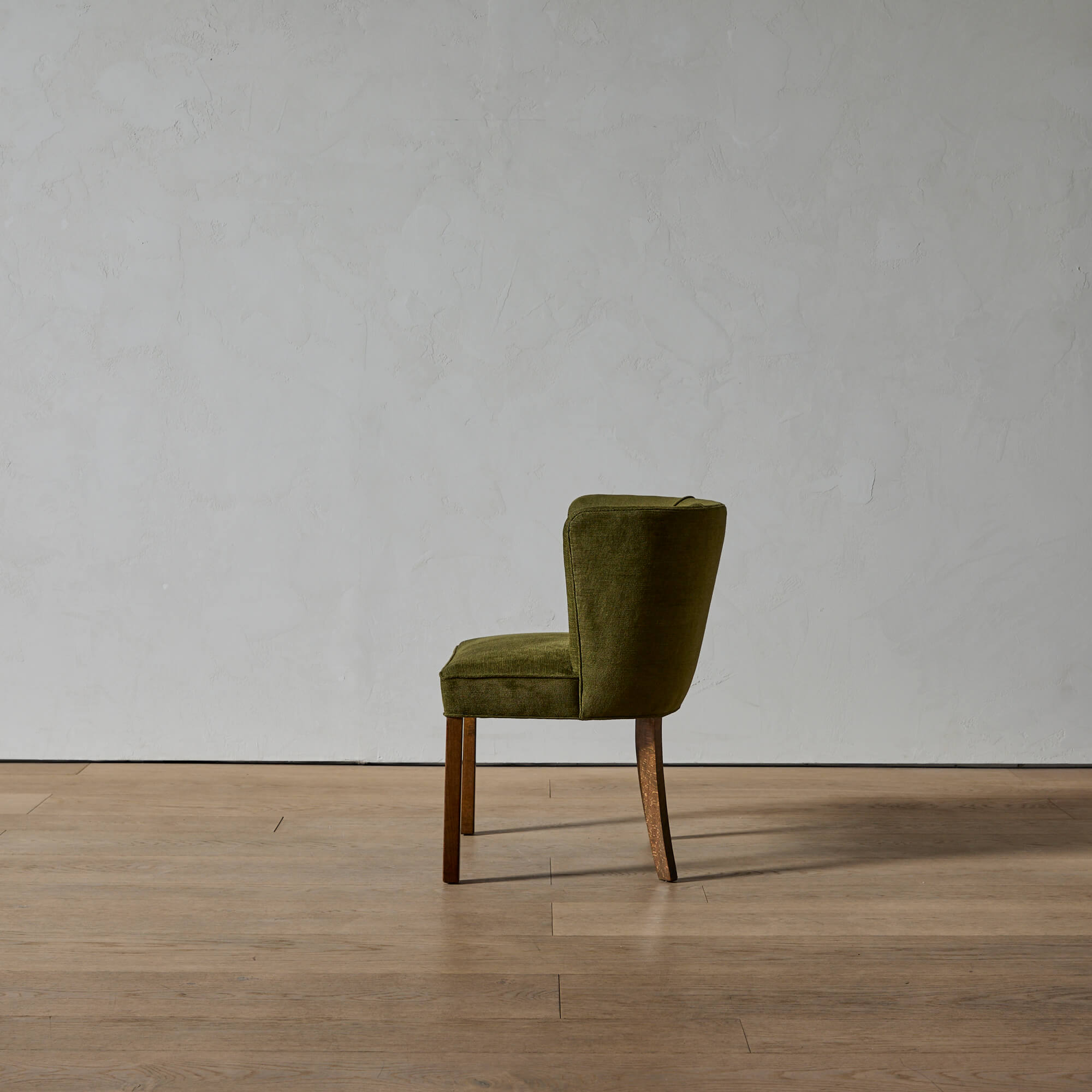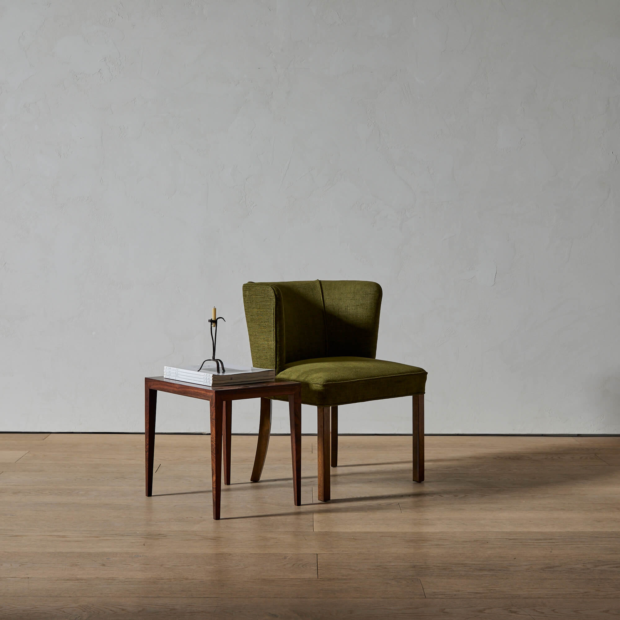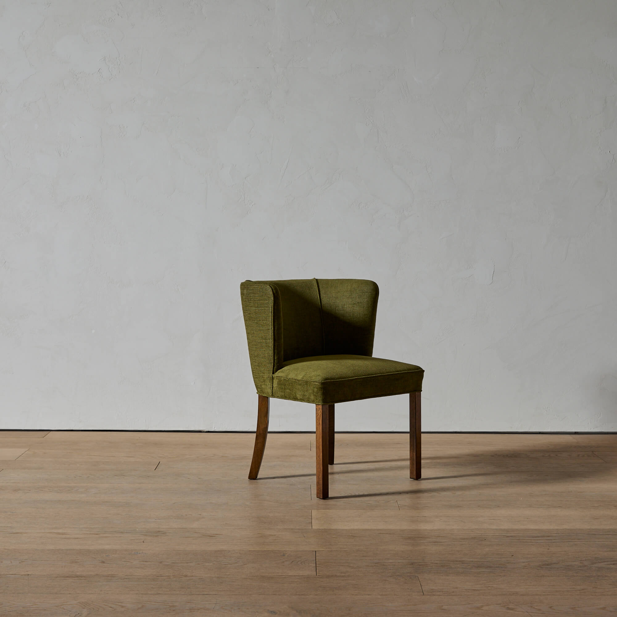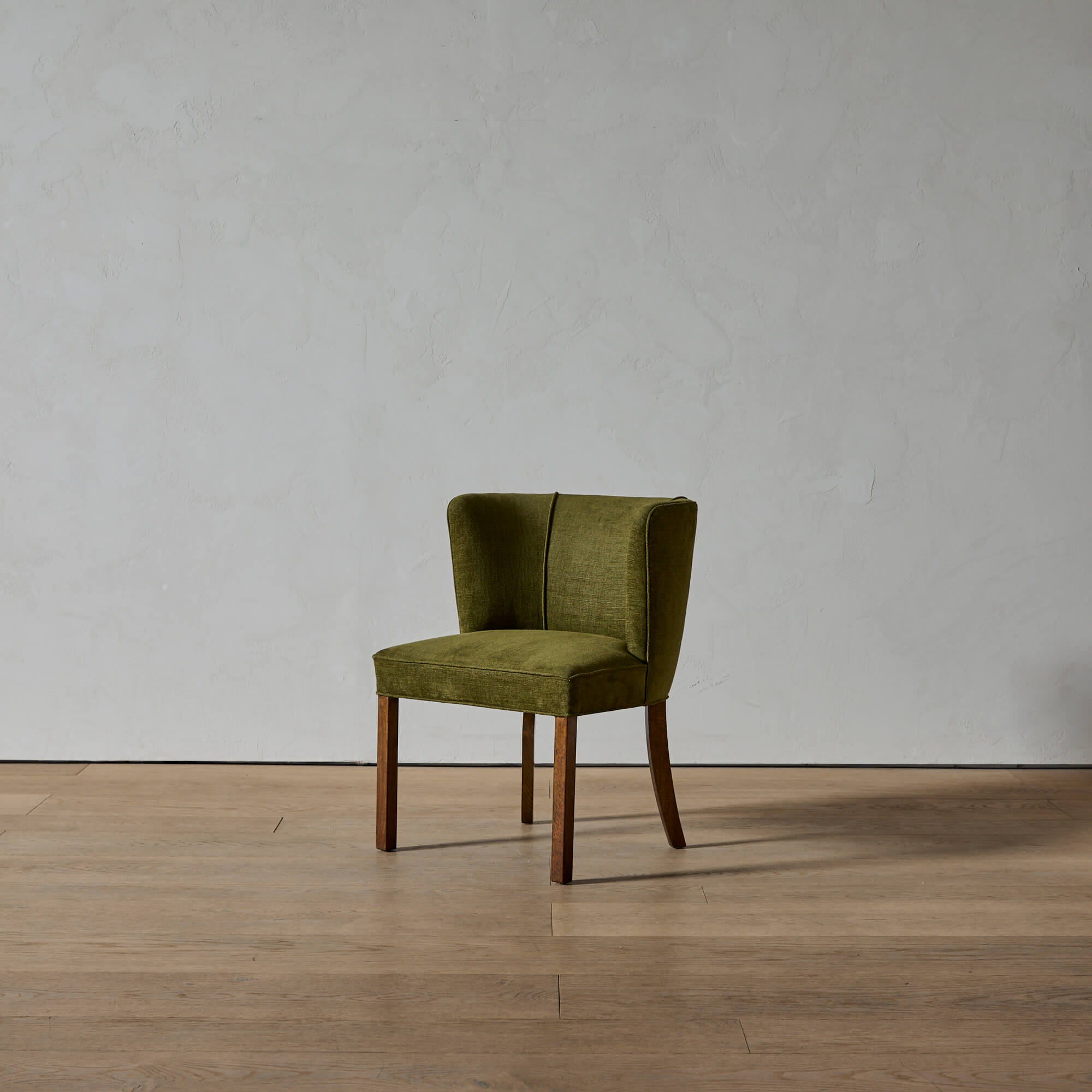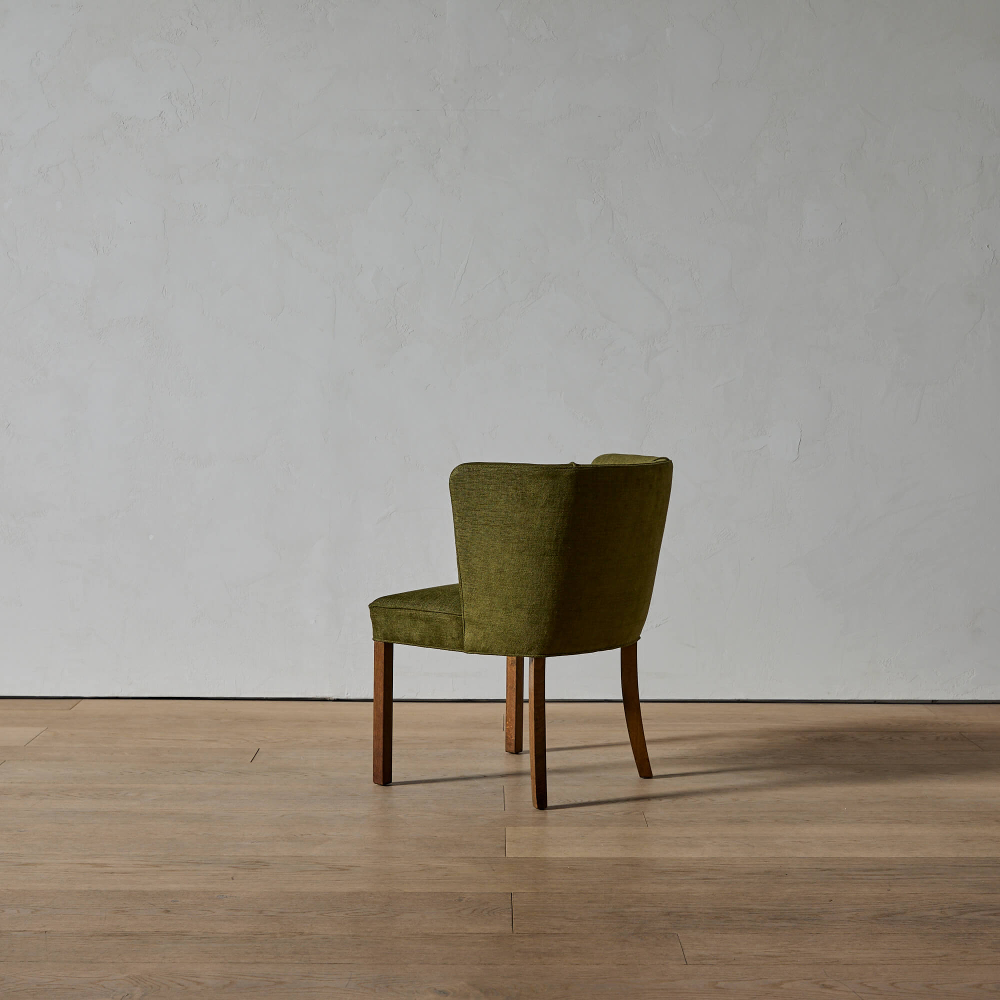 The Model 1514 chair curves gently around the back and stands on darkly stained, minimalist beech legs. Recently reupholstered in an olive linen blend from Savel.
