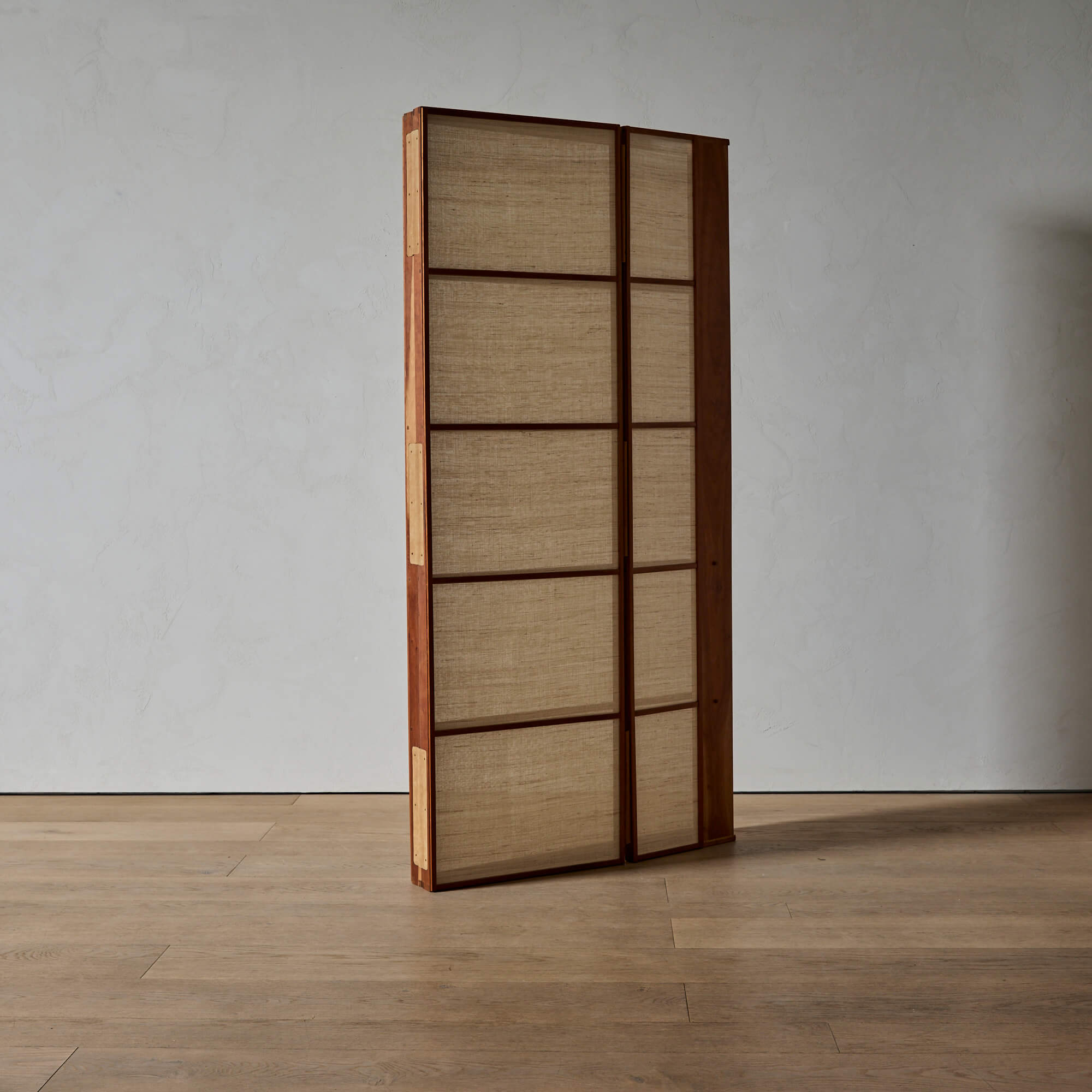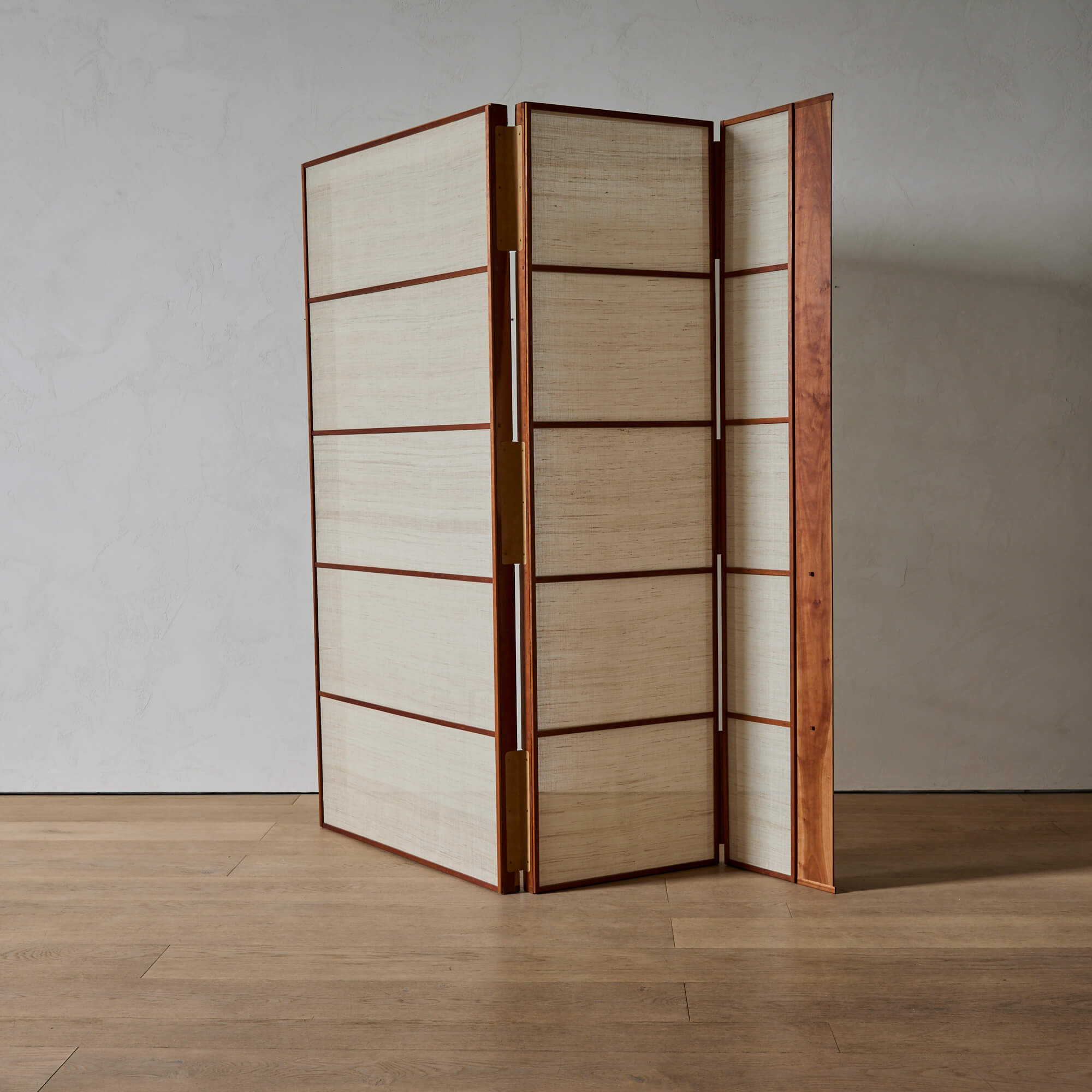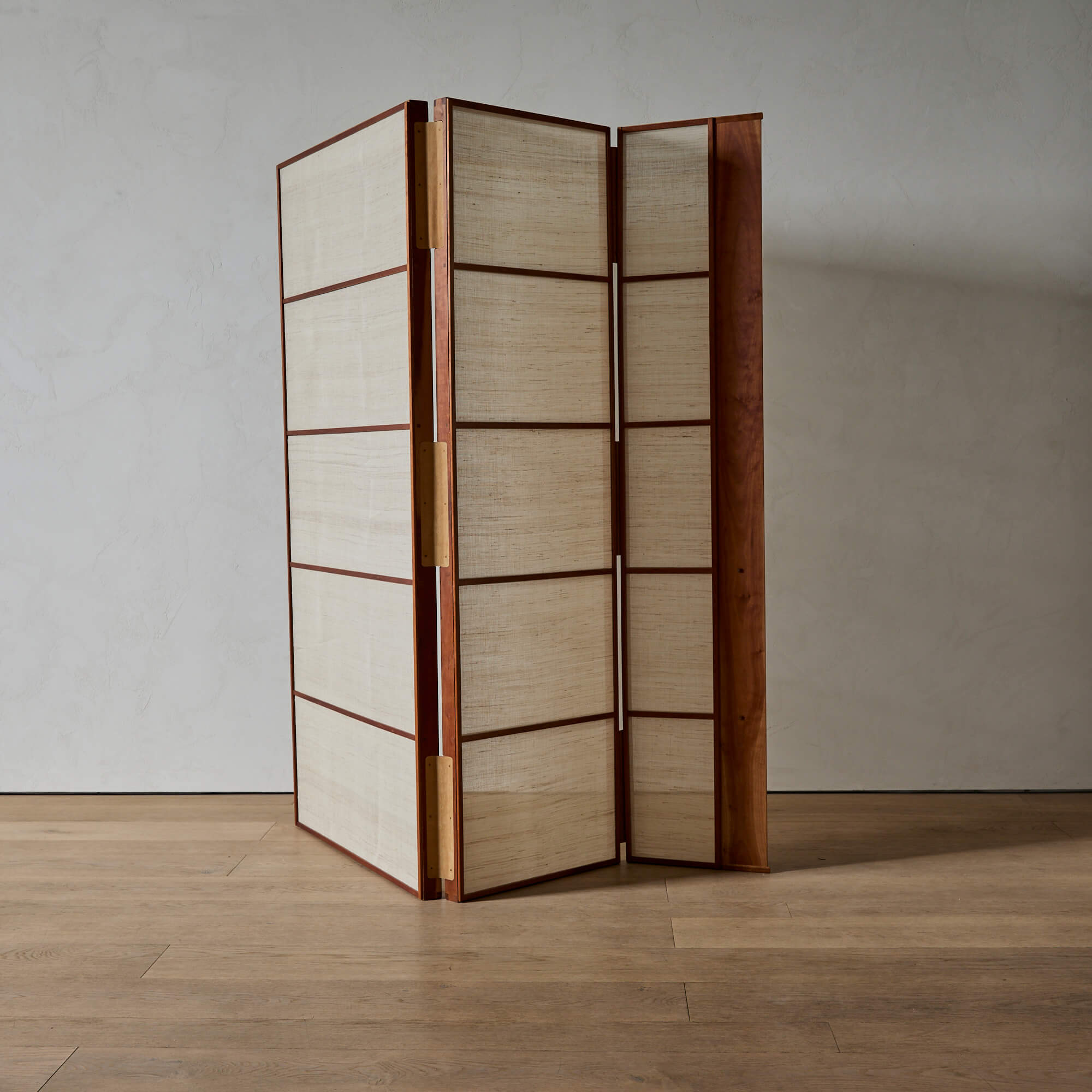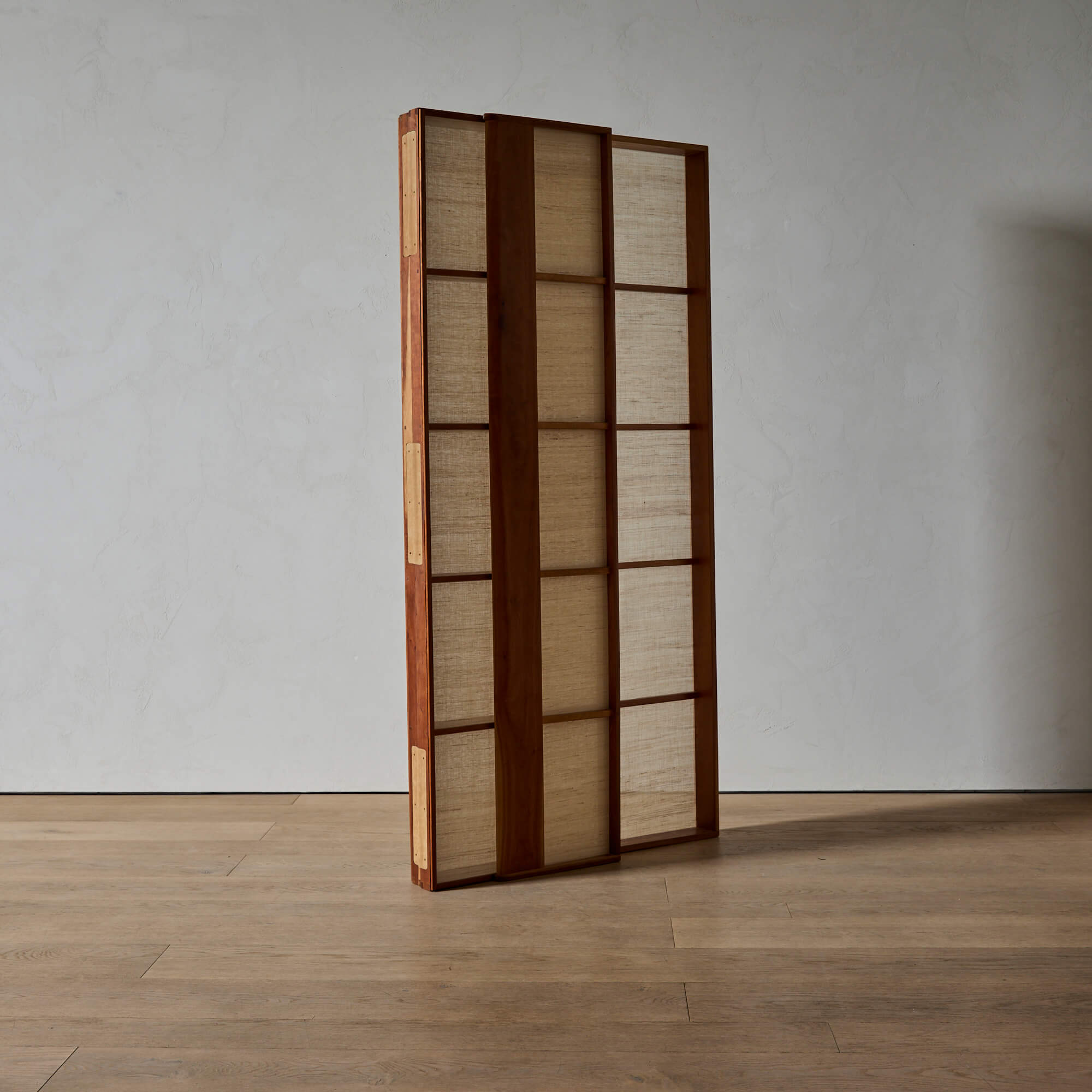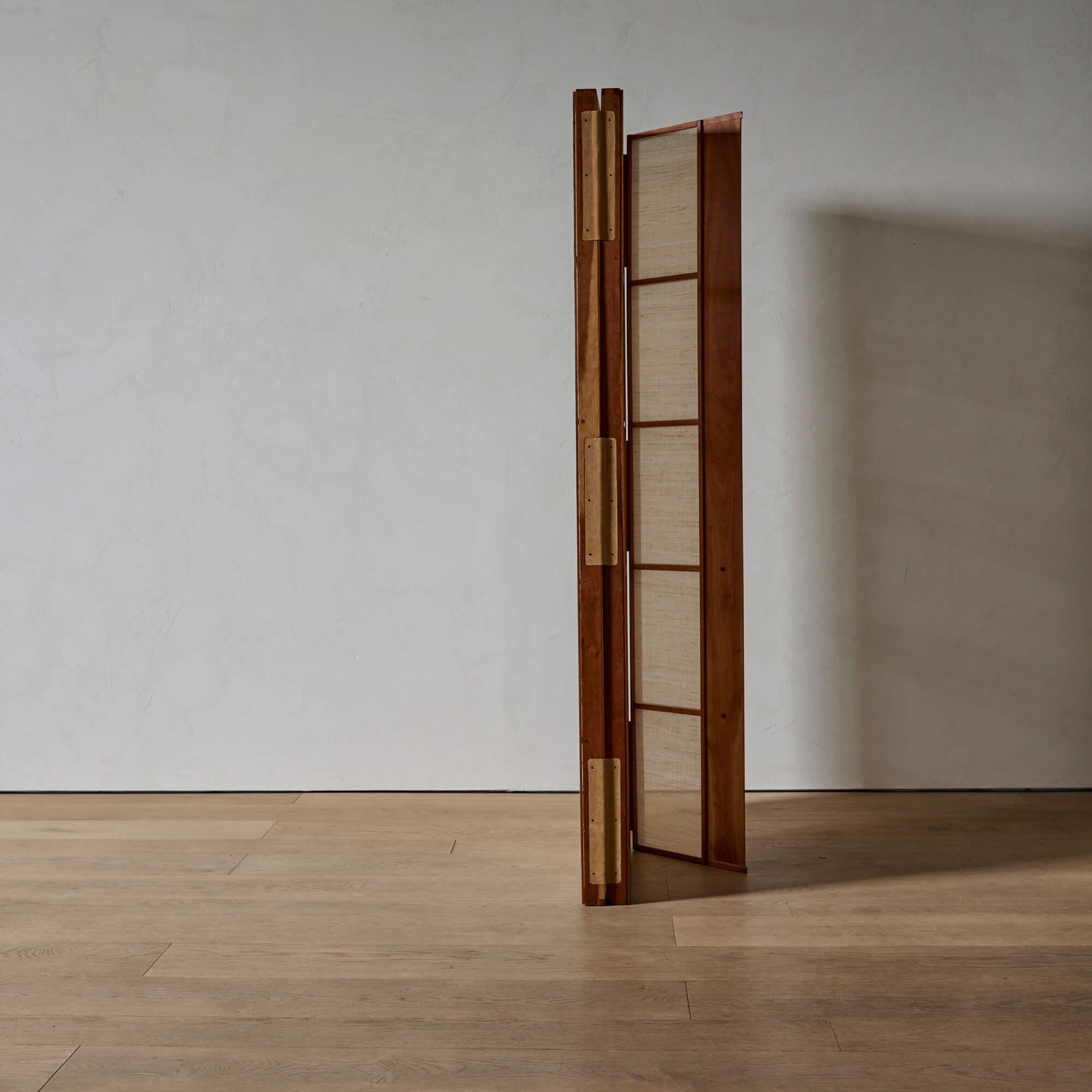 A folding screen of finely figured teak, showcasing exquisite Japanese joinery and leather hinges, designed by architect Matthew Baird. The three panels are asymmetrical, in excellent proportion to each other. Within each wooden frame is a panel of hand-woven nettle cloth through which light is beautifully diffused.