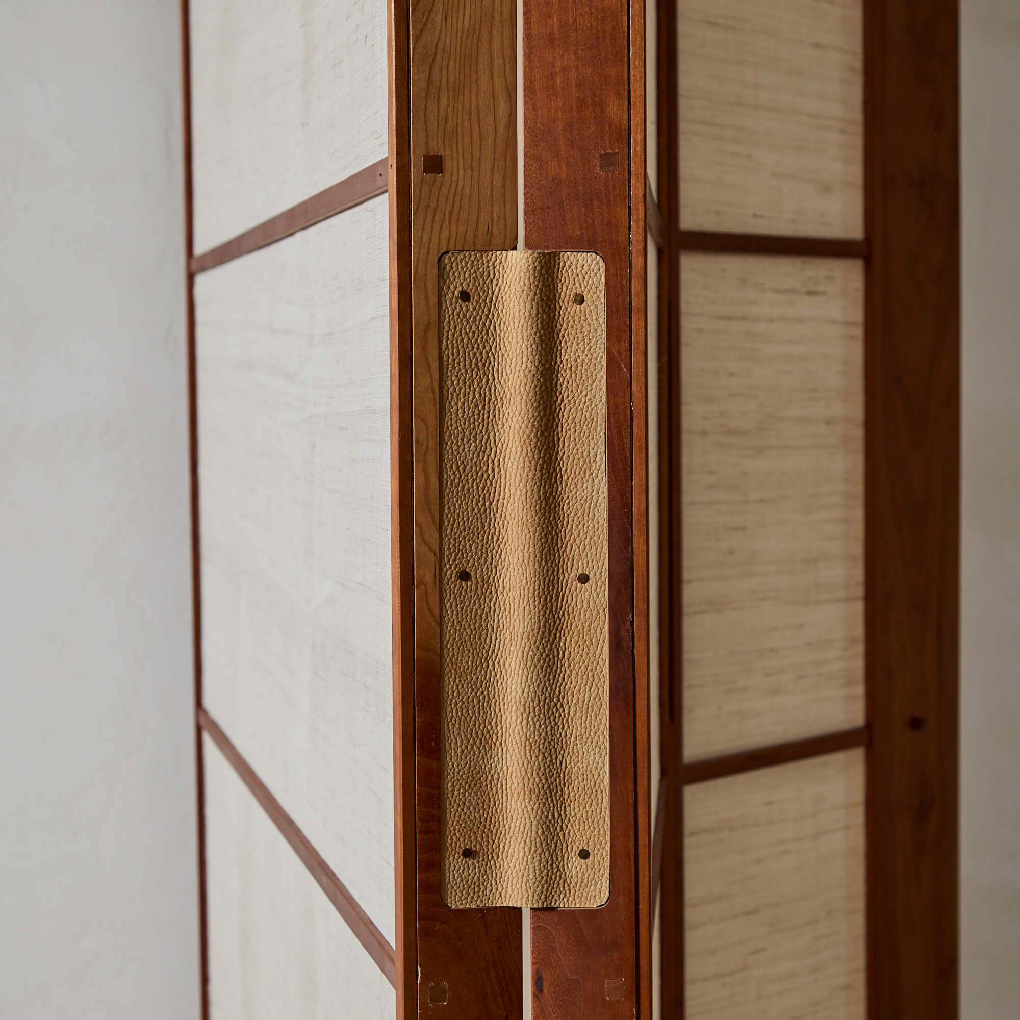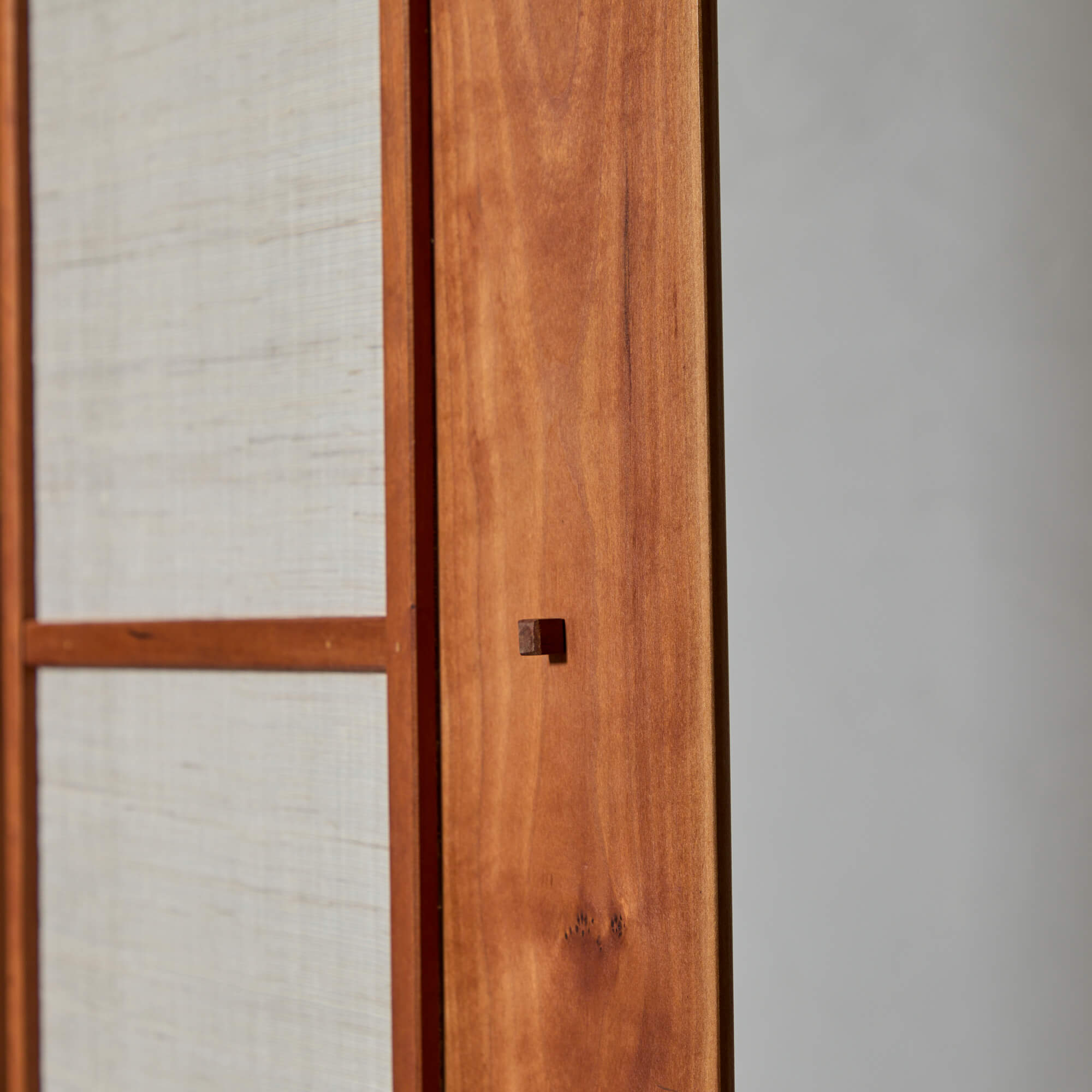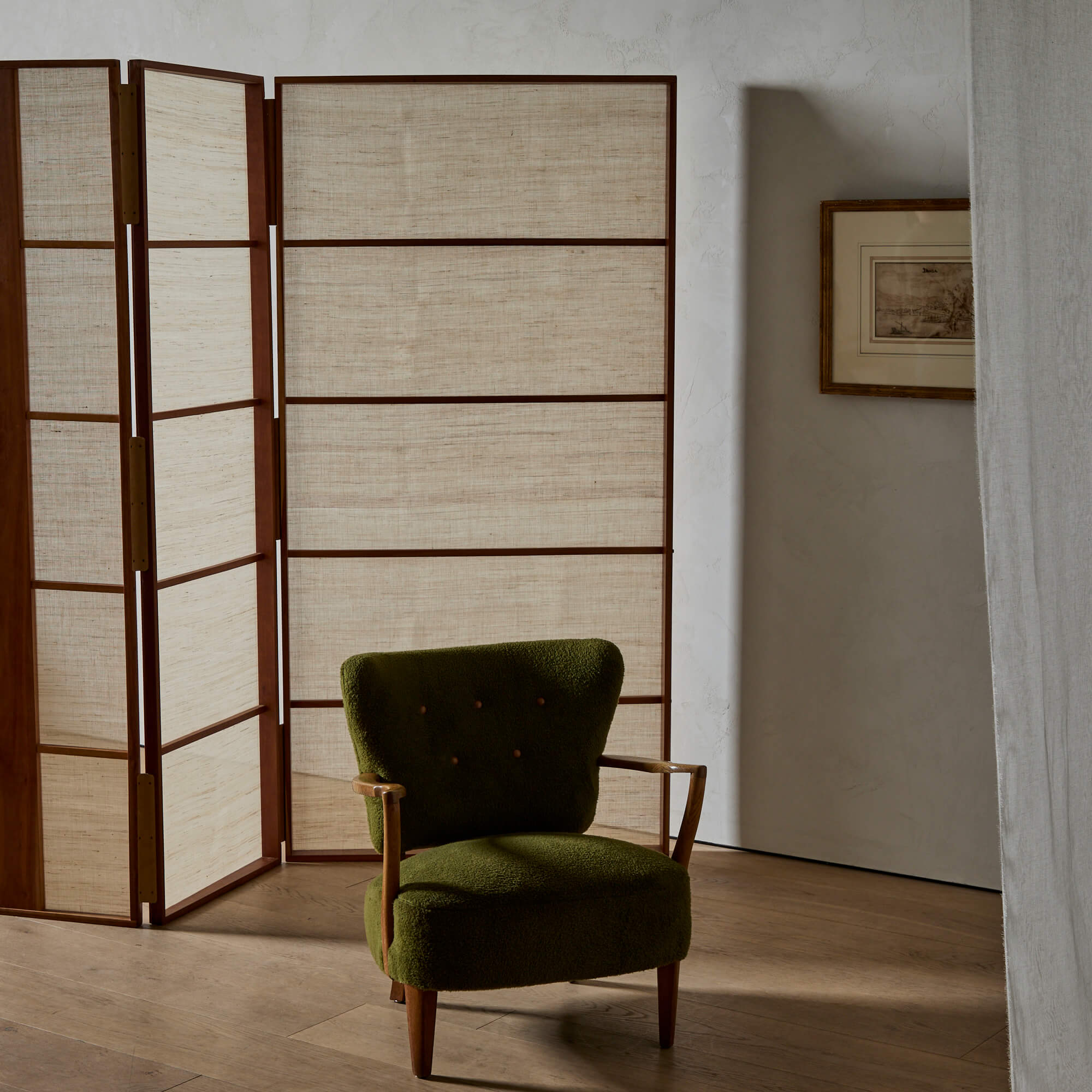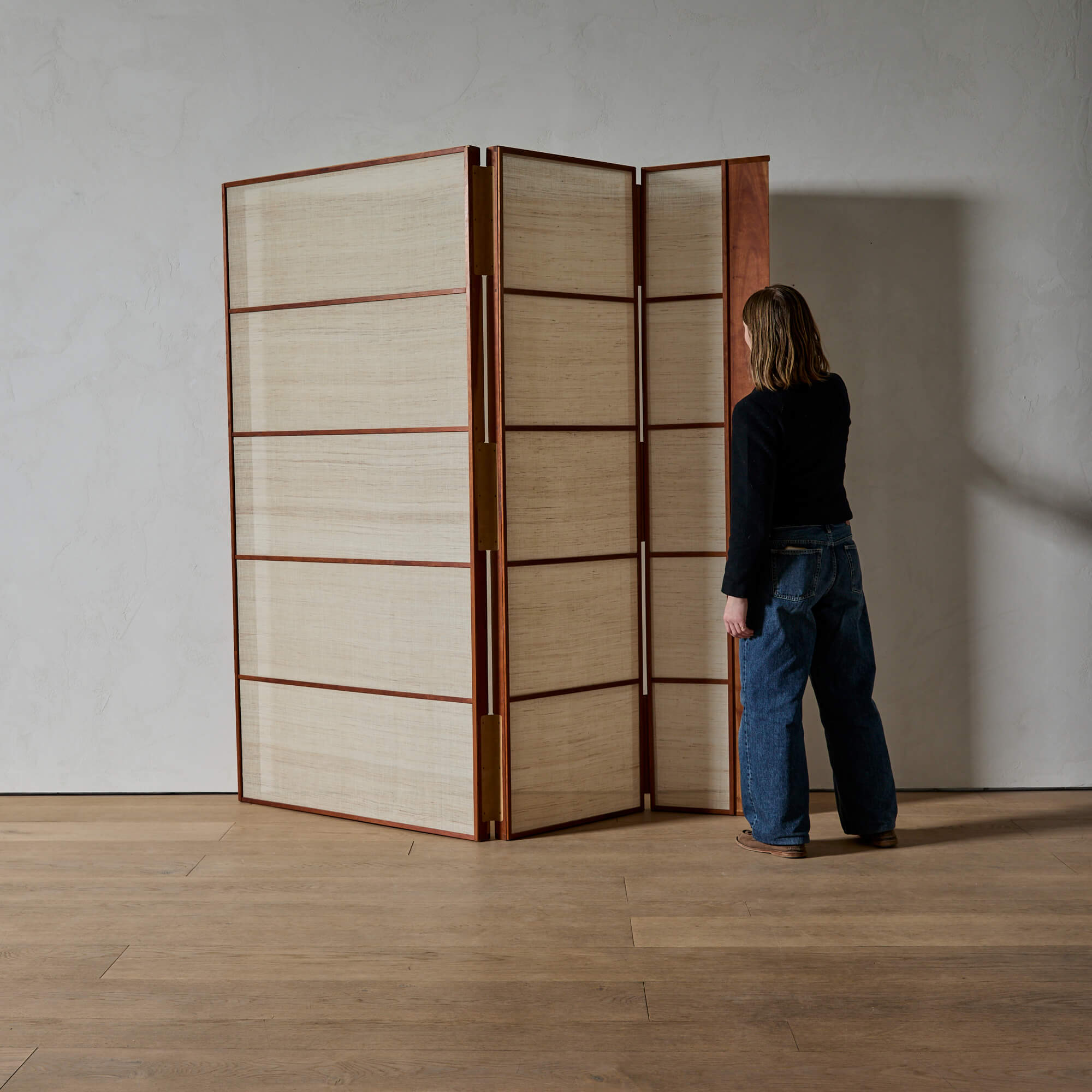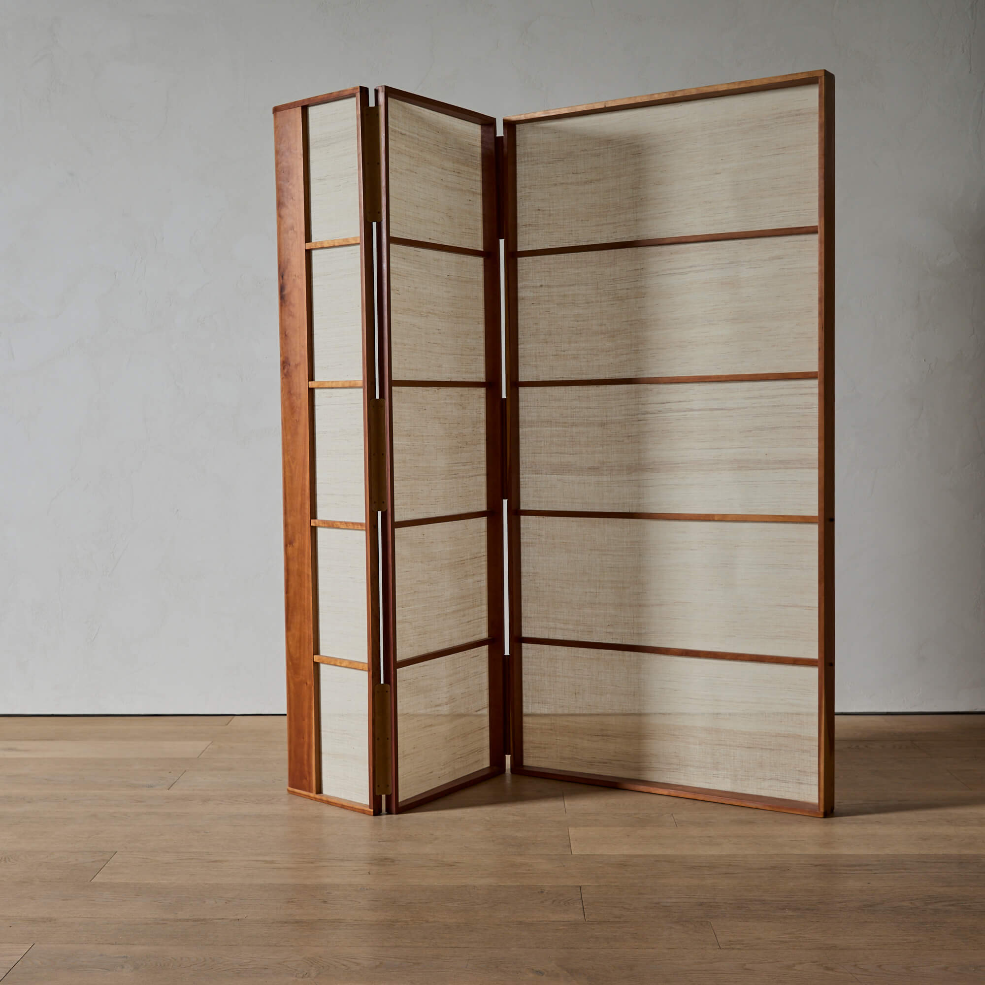 A folding screen of finely figured teak, showcasing exquisite Japanese joinery and leather hinges, designed by architect Matthew Baird. The three panels are asymmetrical, in excellent proportion to each other. Within each wooden frame is a panel of hand-woven nettle cloth through which light is beautifully diffused.