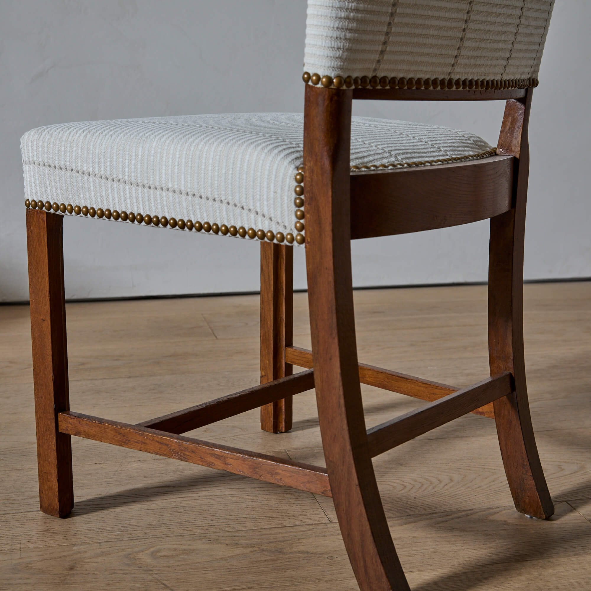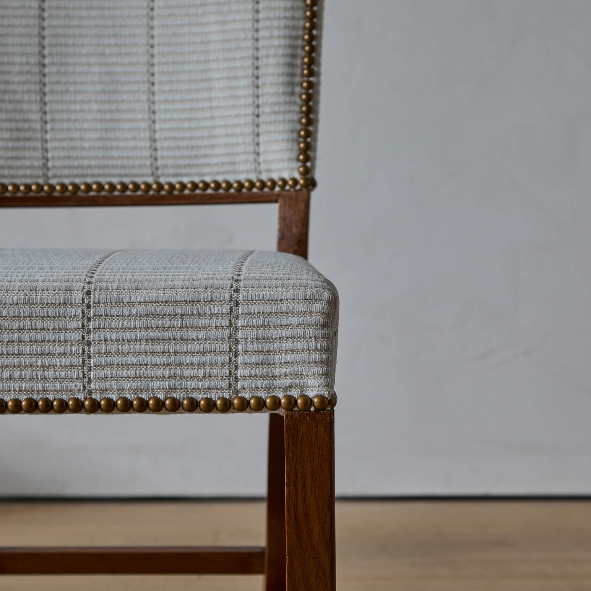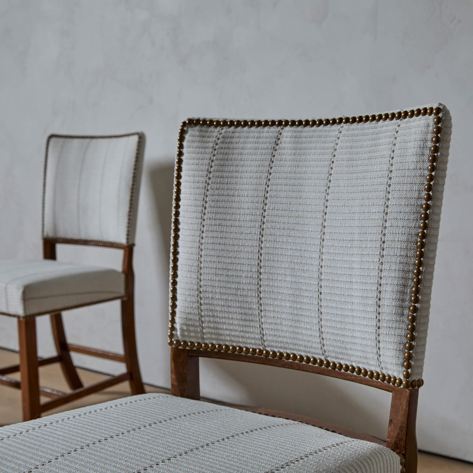 Ole Wanscher was often inspired by his mentor and teacher, Kaare Klint. This particular design echoes Klint’s ‘Red Chair’ in its pared-down elegance. These two chairs have been newly reupholstered in a subtle stripe from Savel Fabrics.