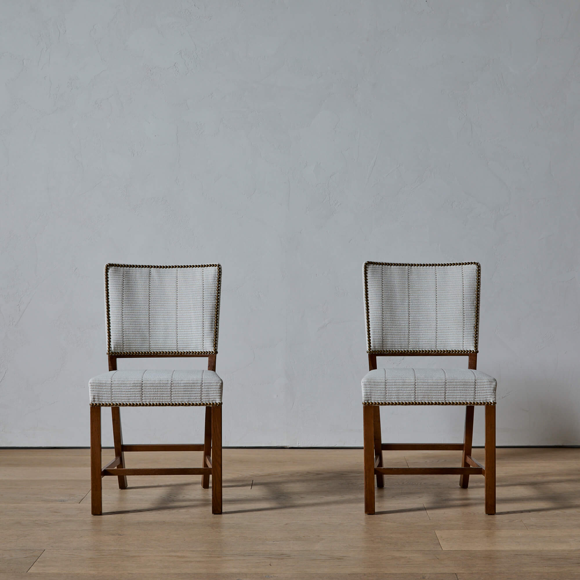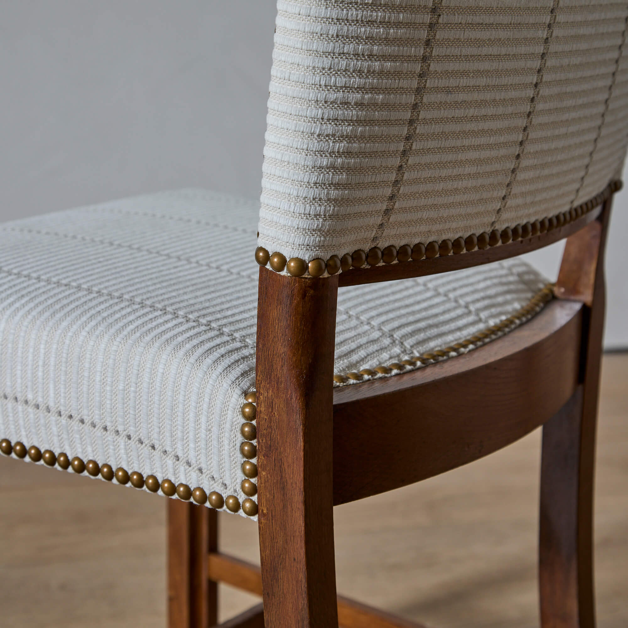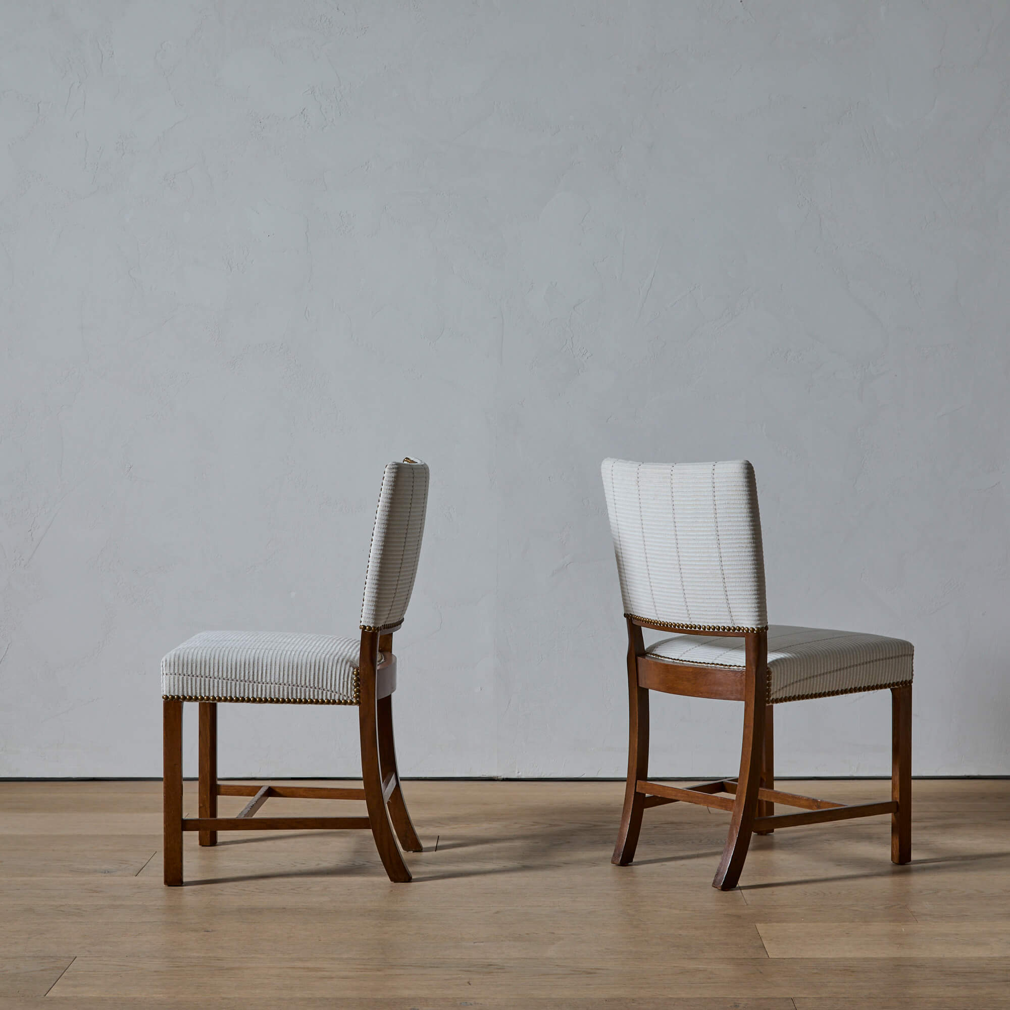 Ole Wanscher was often inspired by his mentor and teacher, Kaare Klint. This particular design echoes Klint’s ‘Red Chair’ in its pared-down elegance. These two chairs have been newly reupholstered in a subtle stripe from Savel Fabrics.