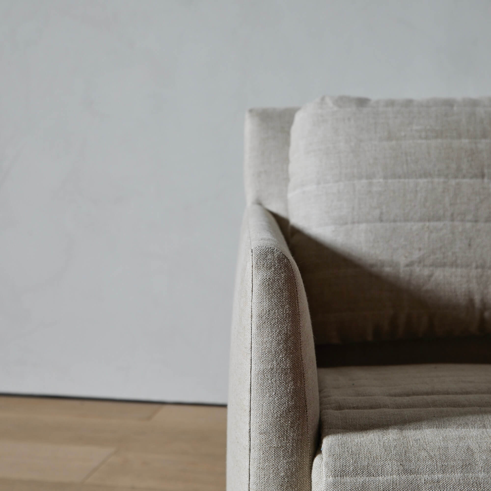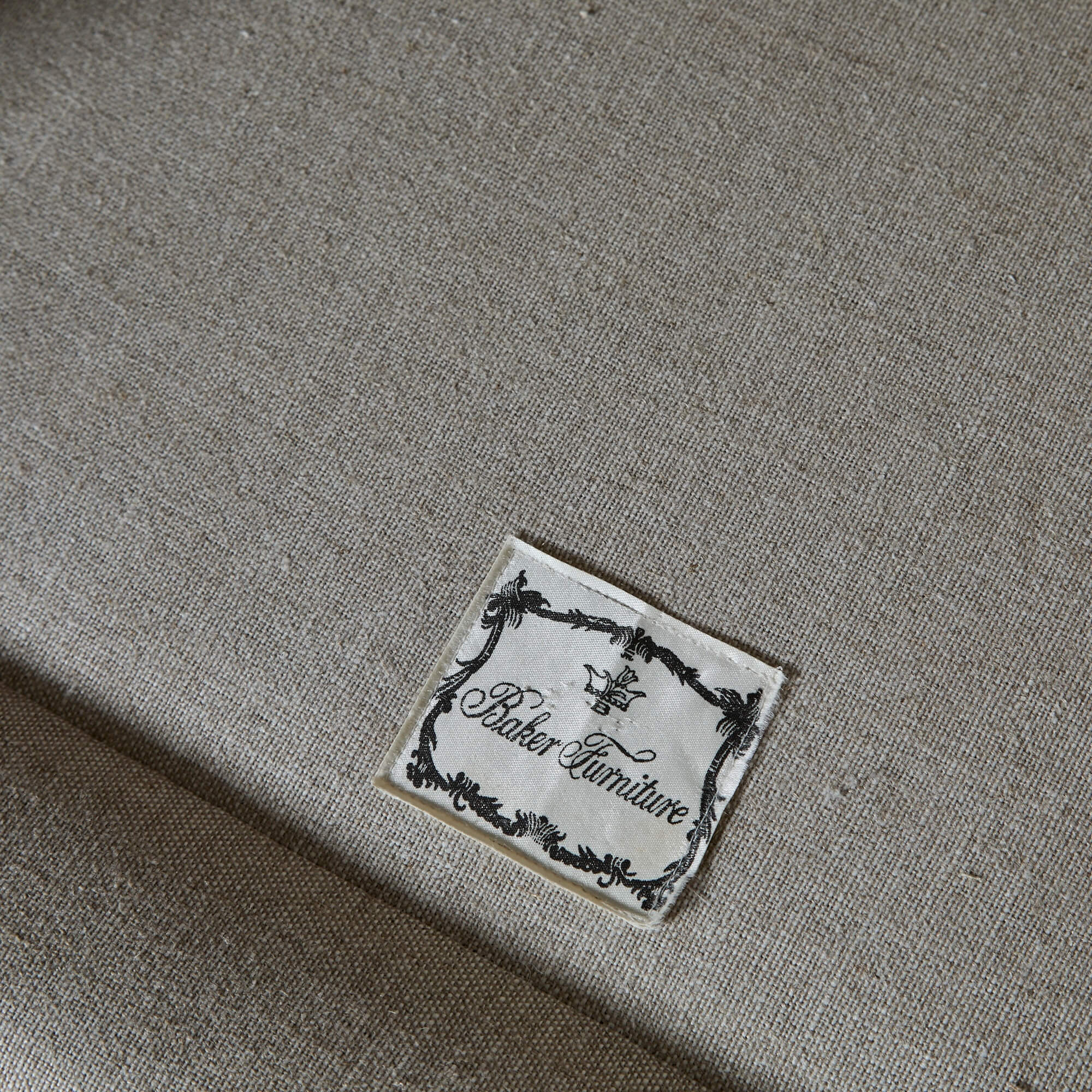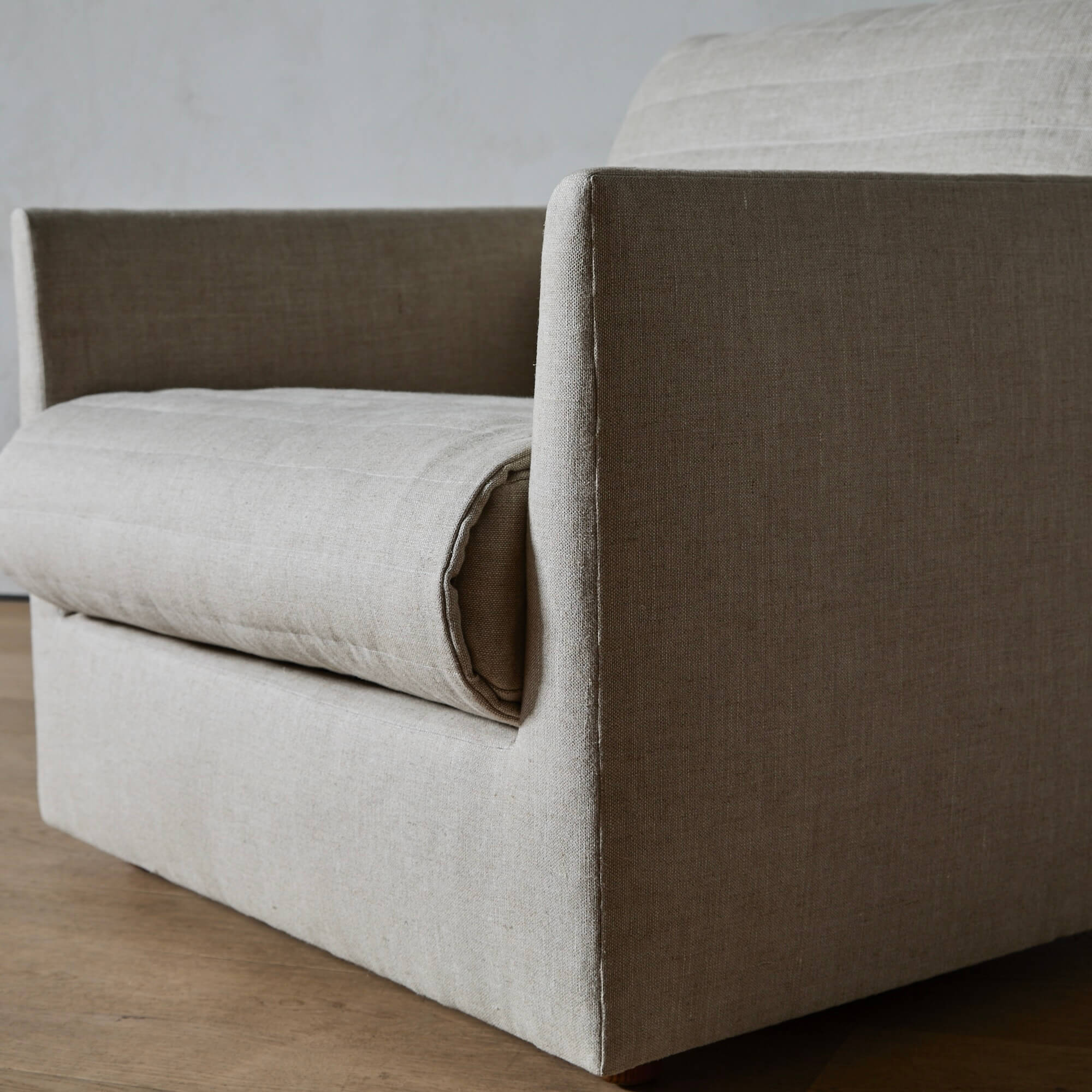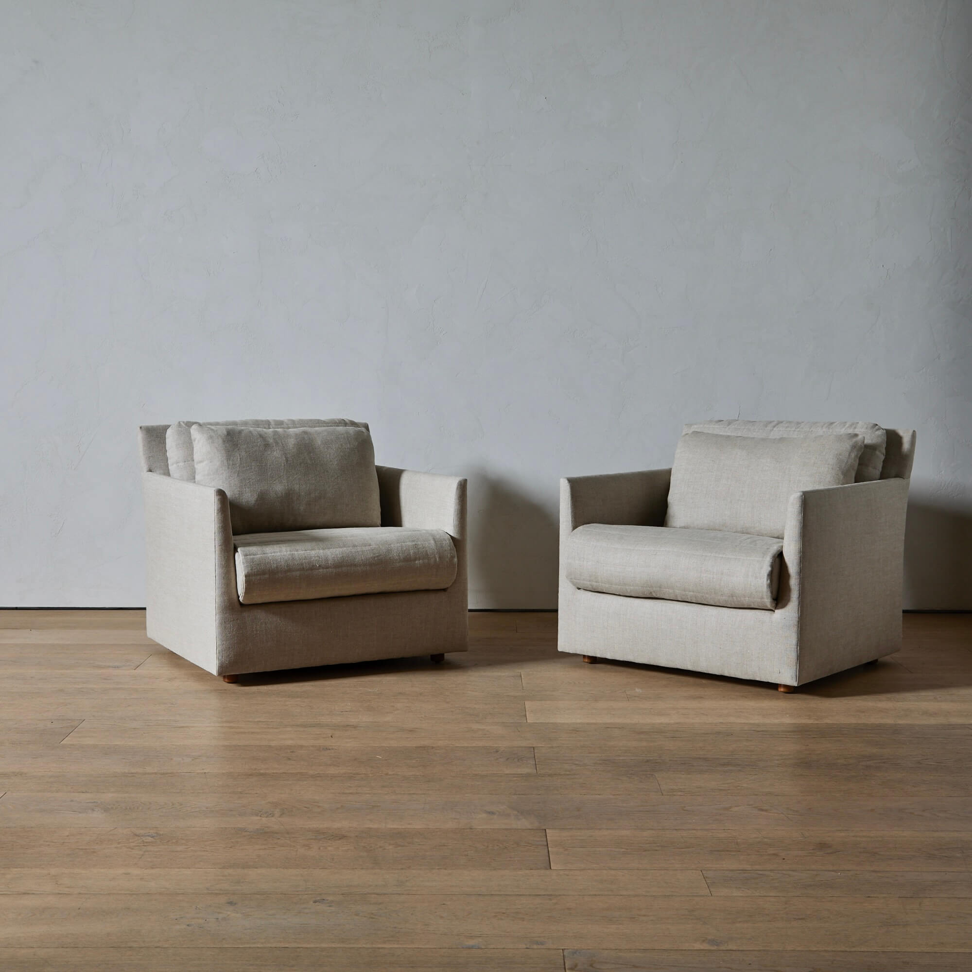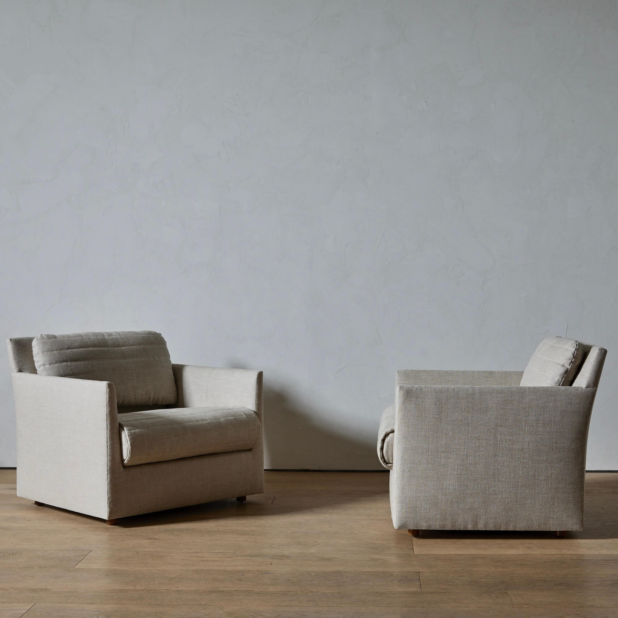 This pair of chairs were designed by John Saladino in the 1980s and produced by Baker Furniture. They feature a unique quilted seat and back pillow. The chair’s generous proportions make it the perfect location to curl up and read a book. Recently upholstered in a natural Belgian linen.