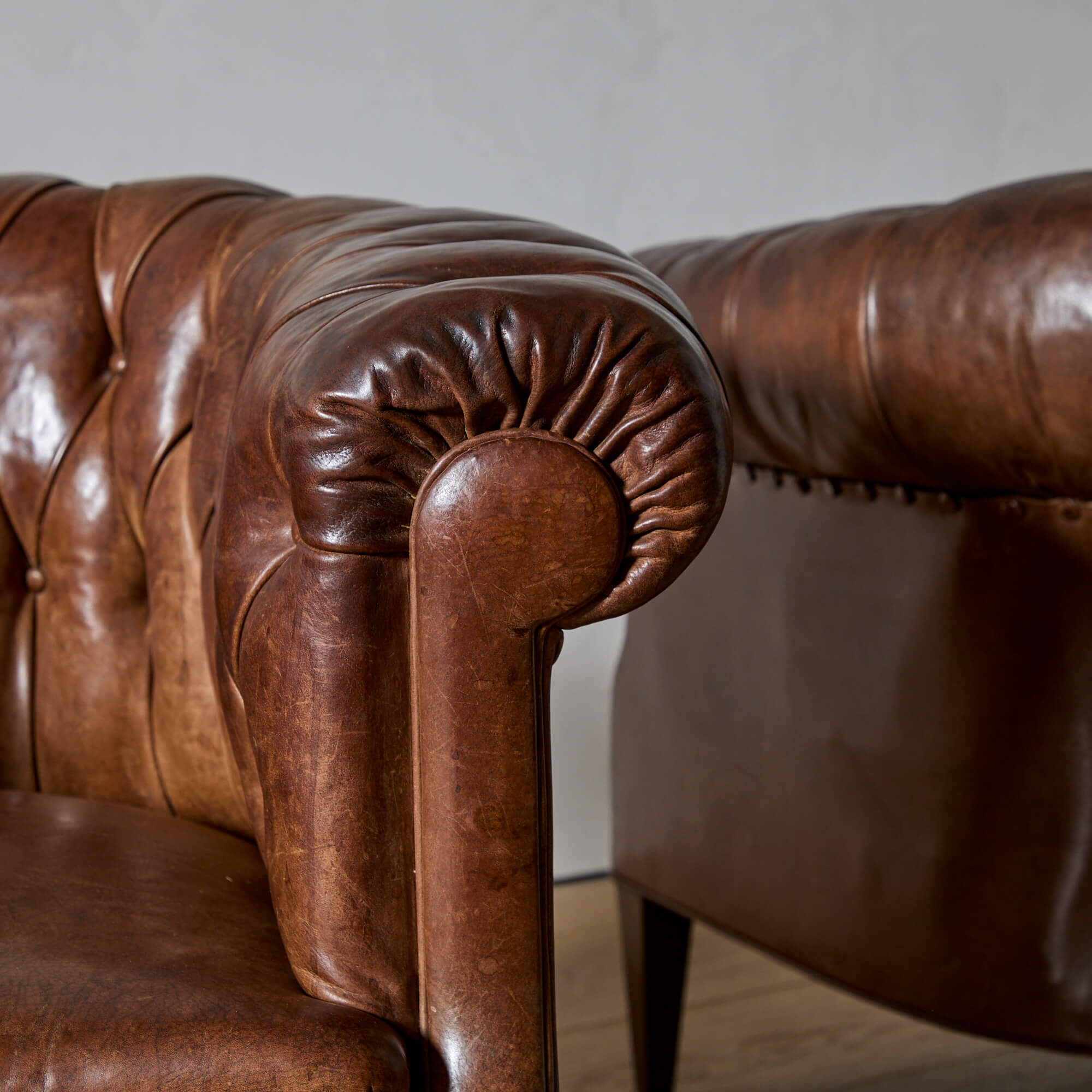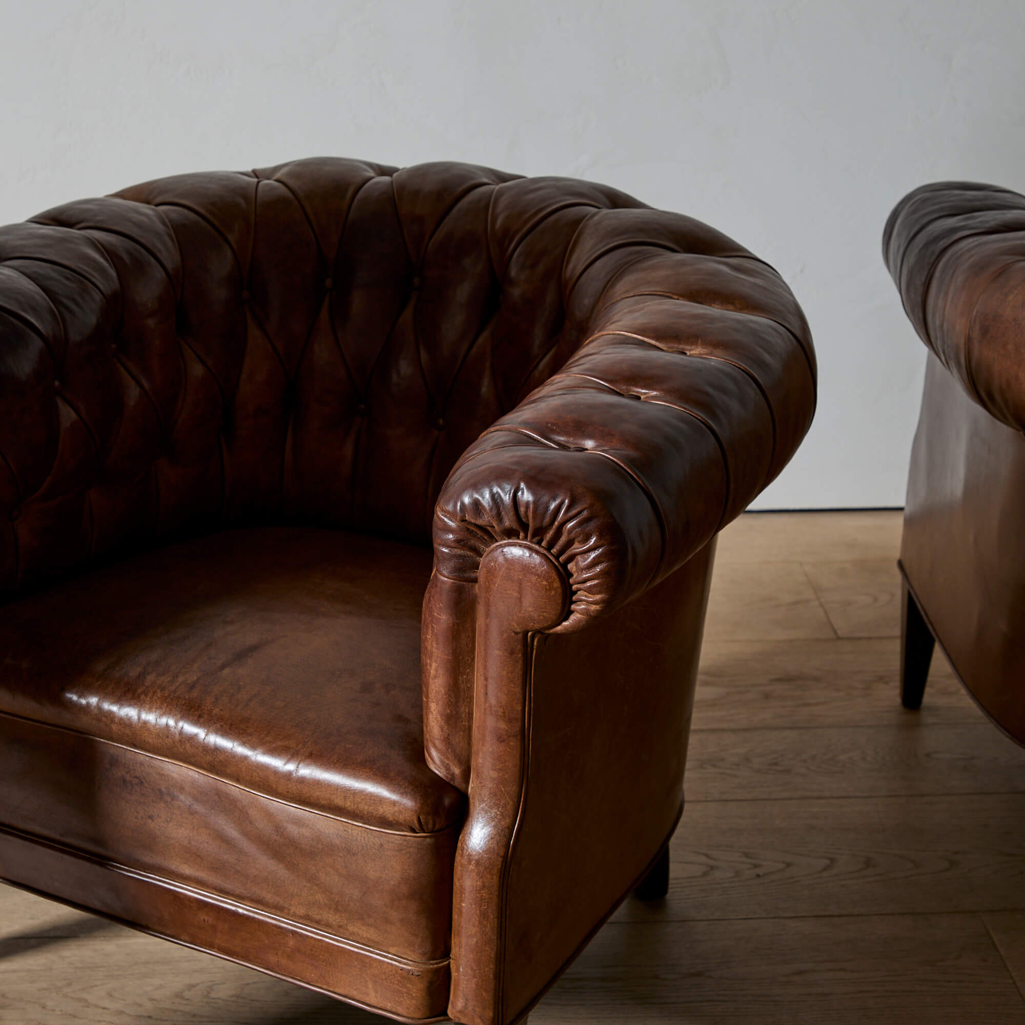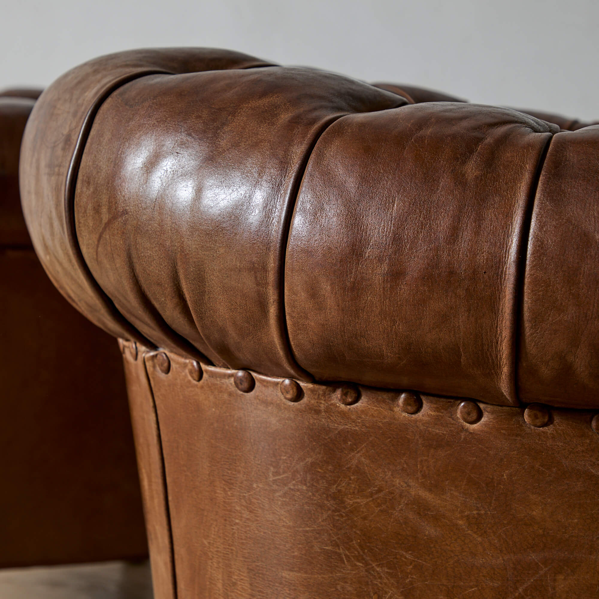 Well-proportioned, with a generous roll arm for perching on. Supple leather upholstery with excellent patina. The seat springs and inner cushions have been restored, so these are comfortable and ready for use.