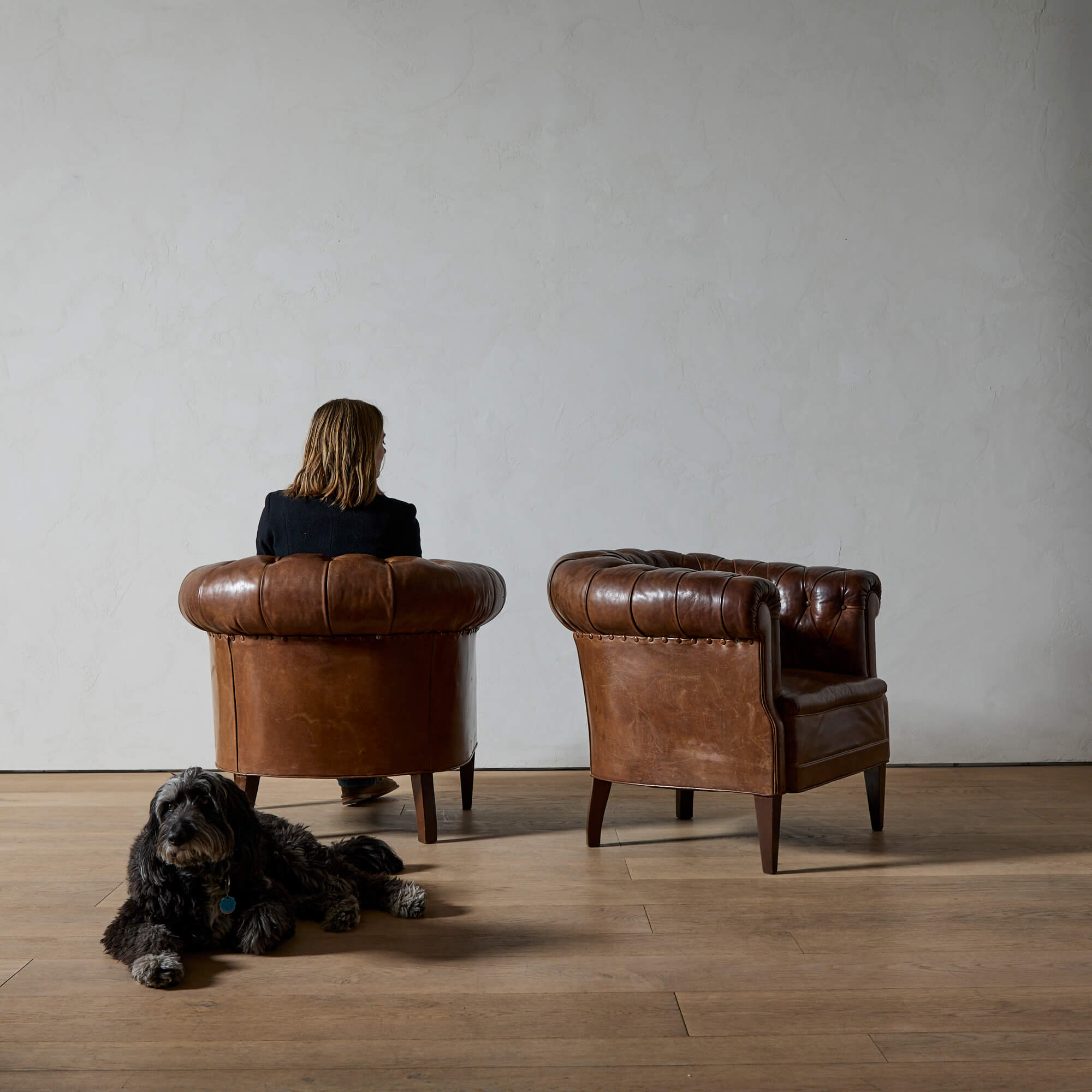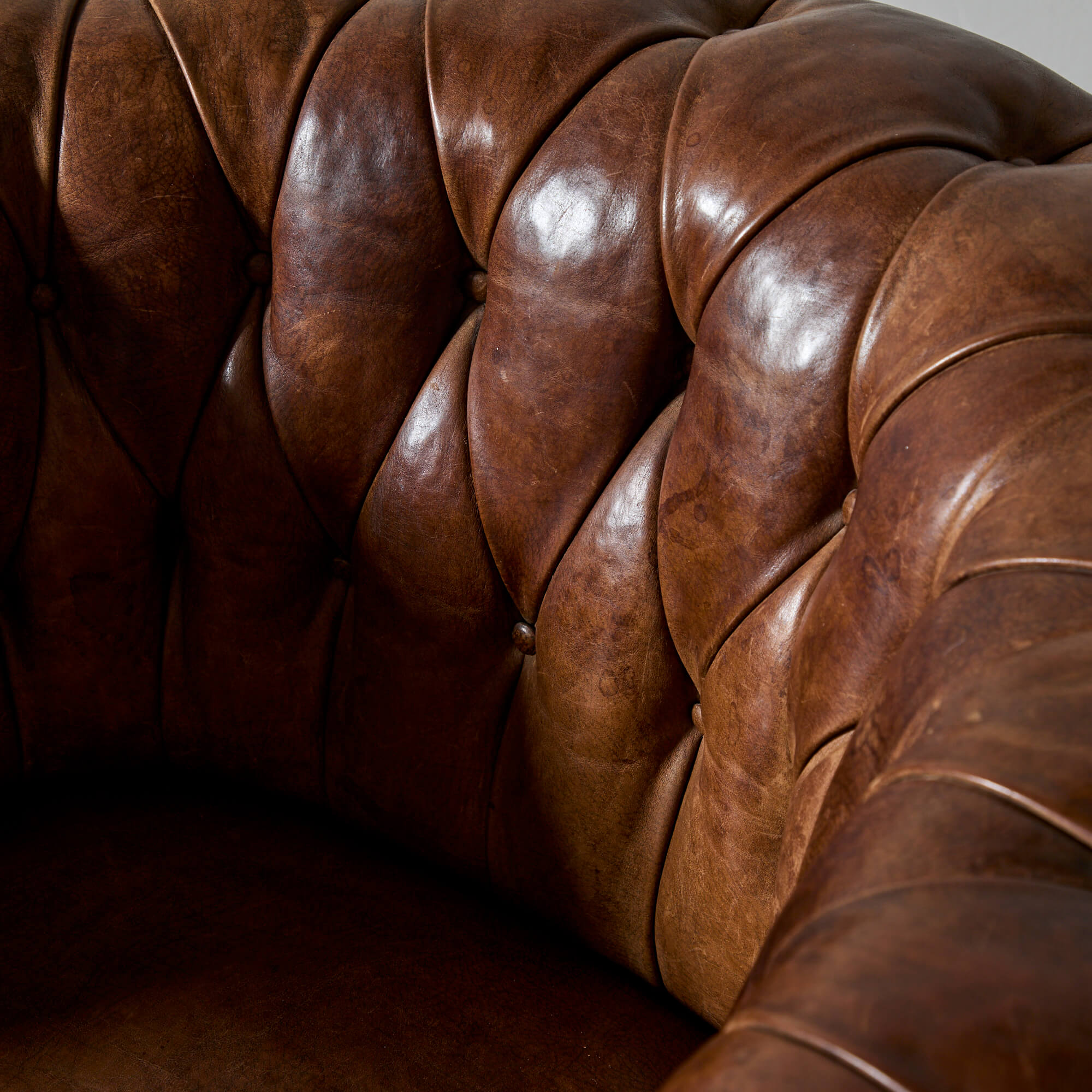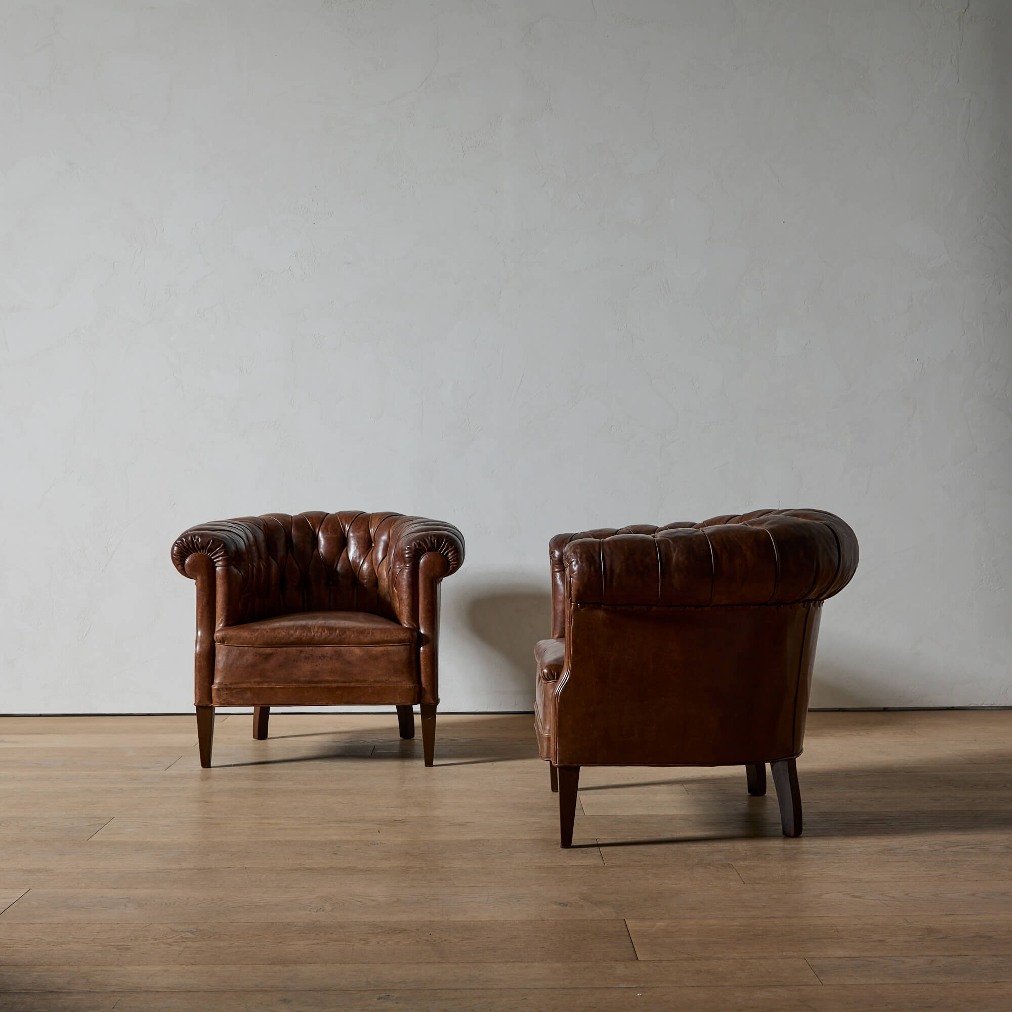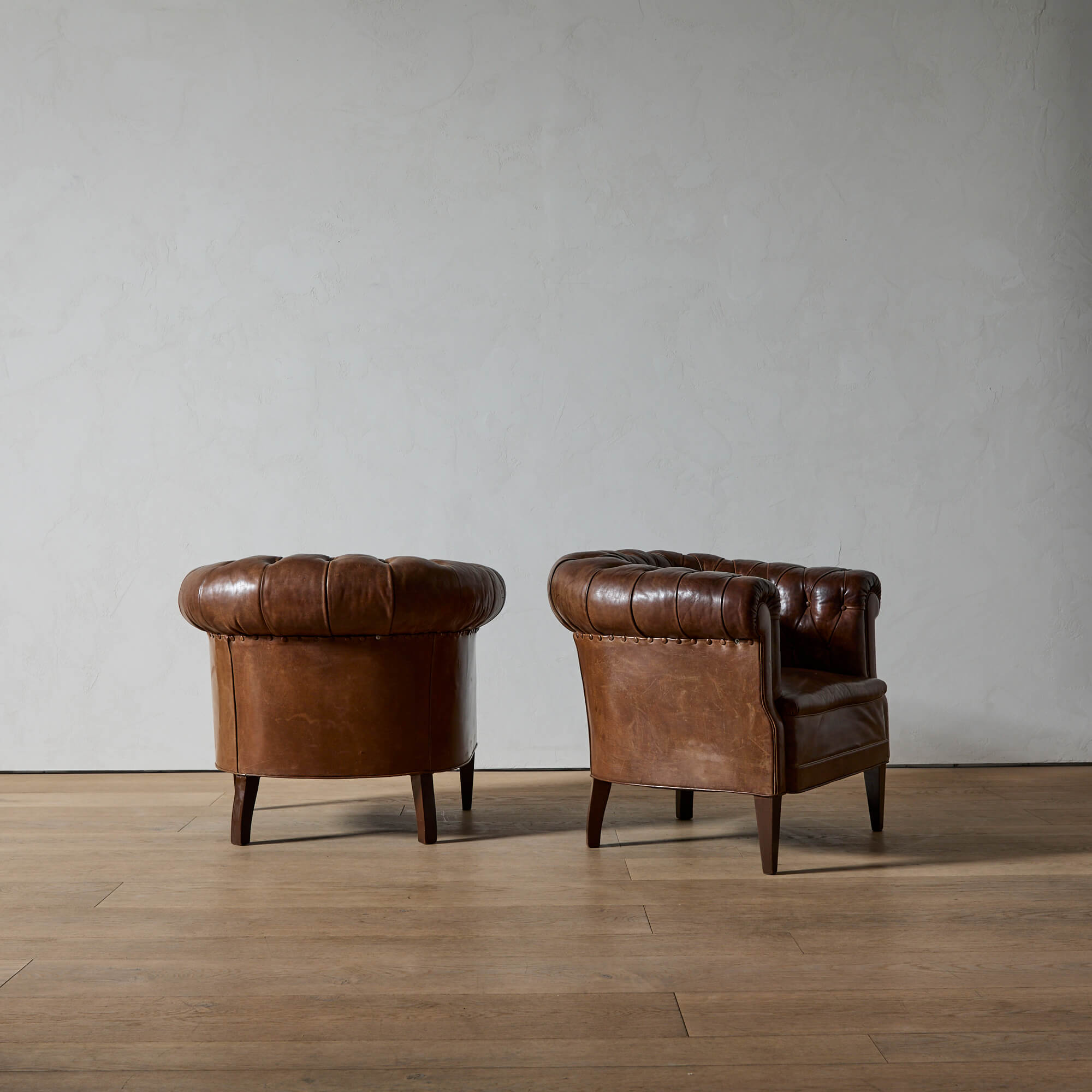Well-proportioned, with a generous roll arm for perching on. Supple leather upholstery with excellent patina. The seat springs and inner cushions have been restored, so these are comfortable and ready for use.