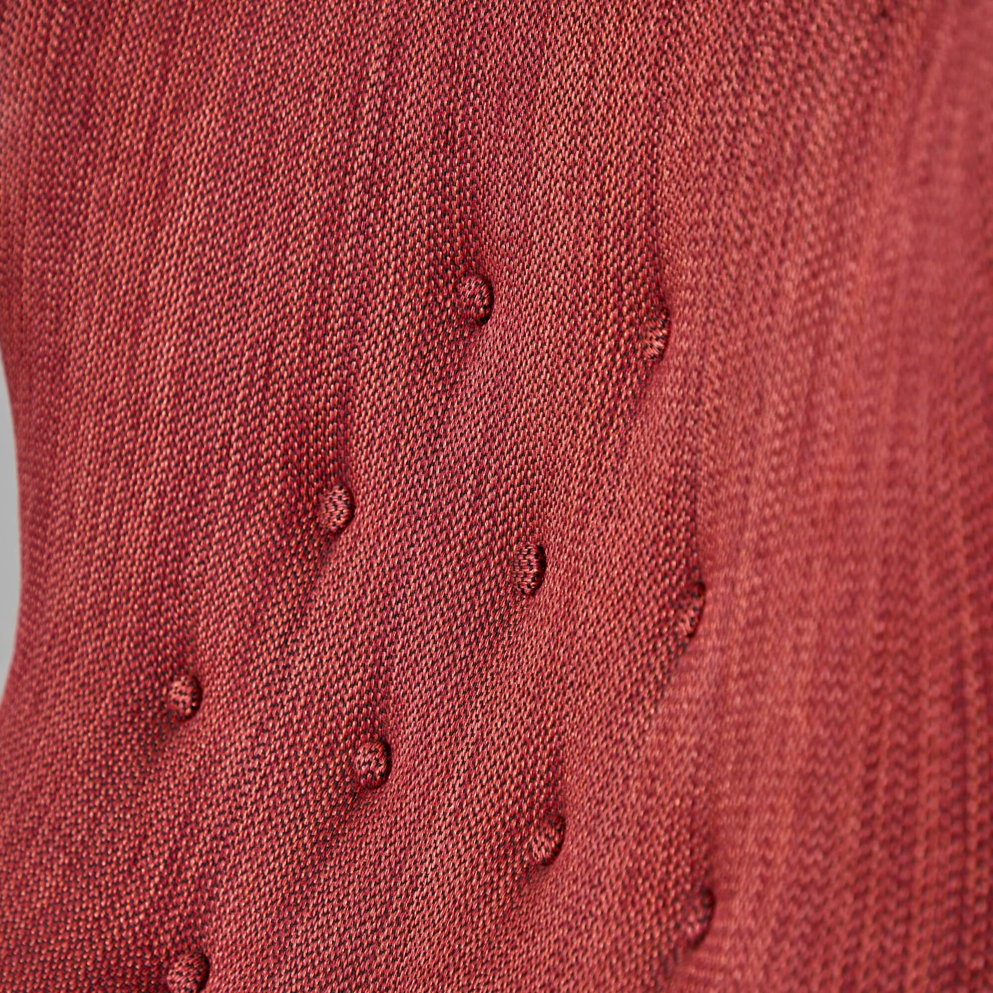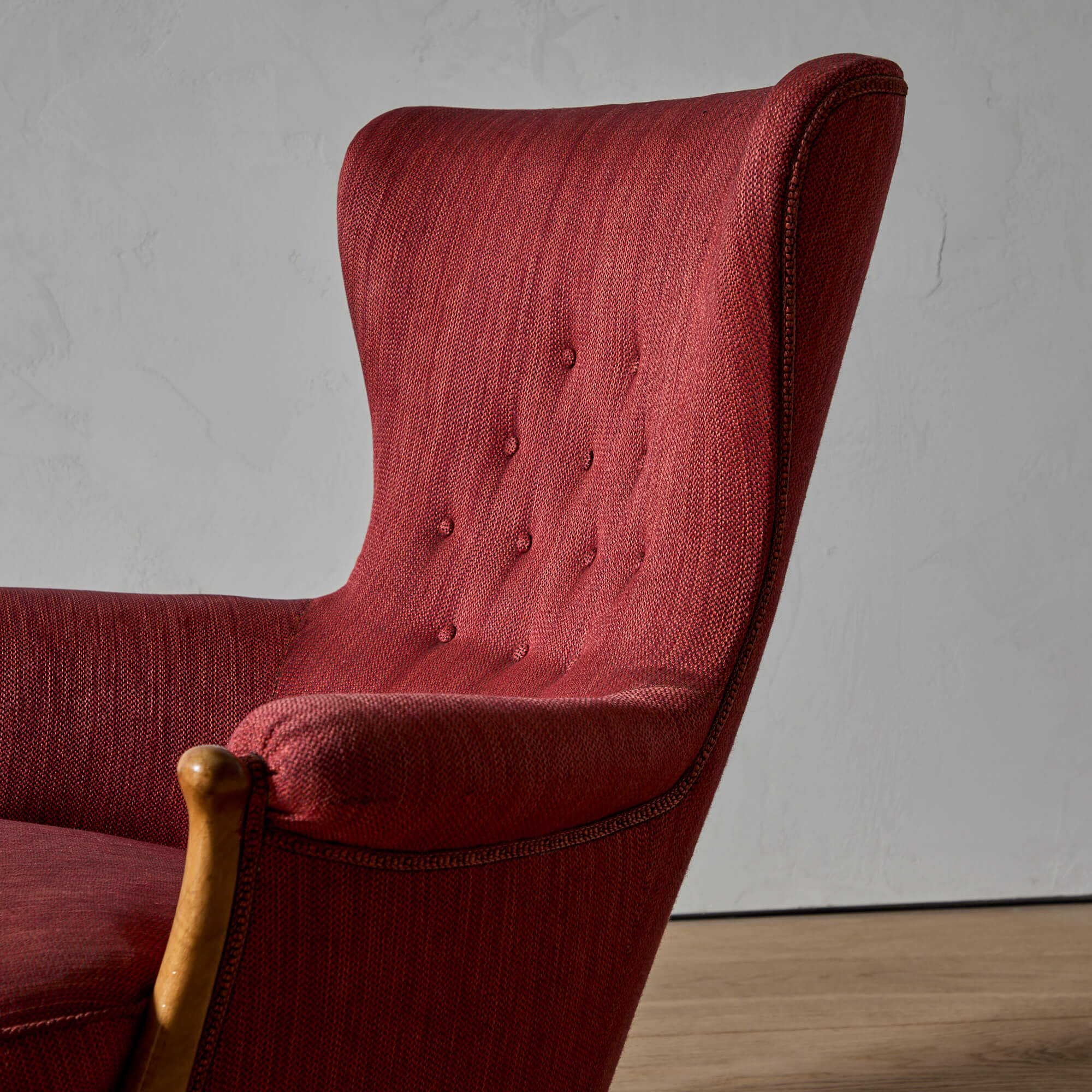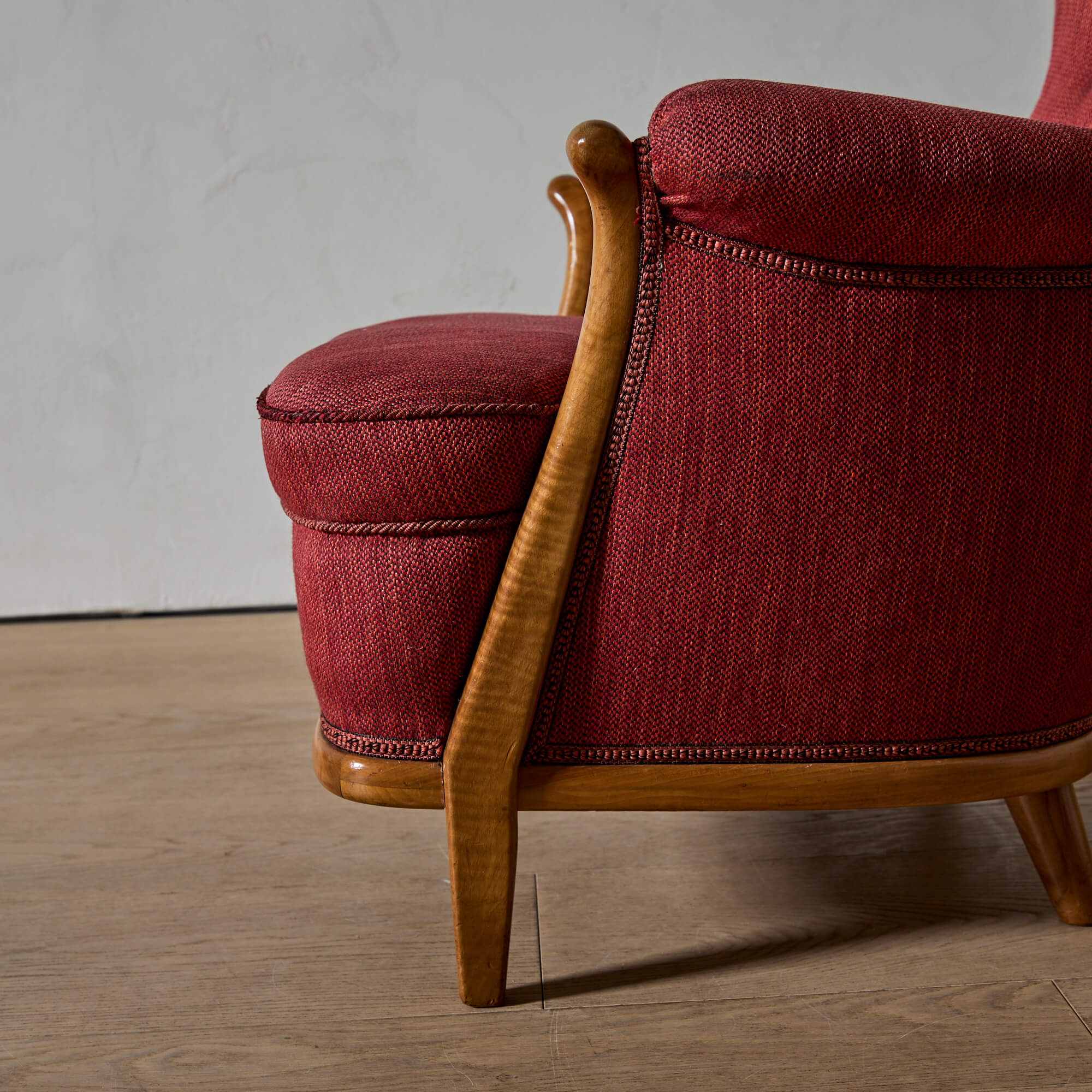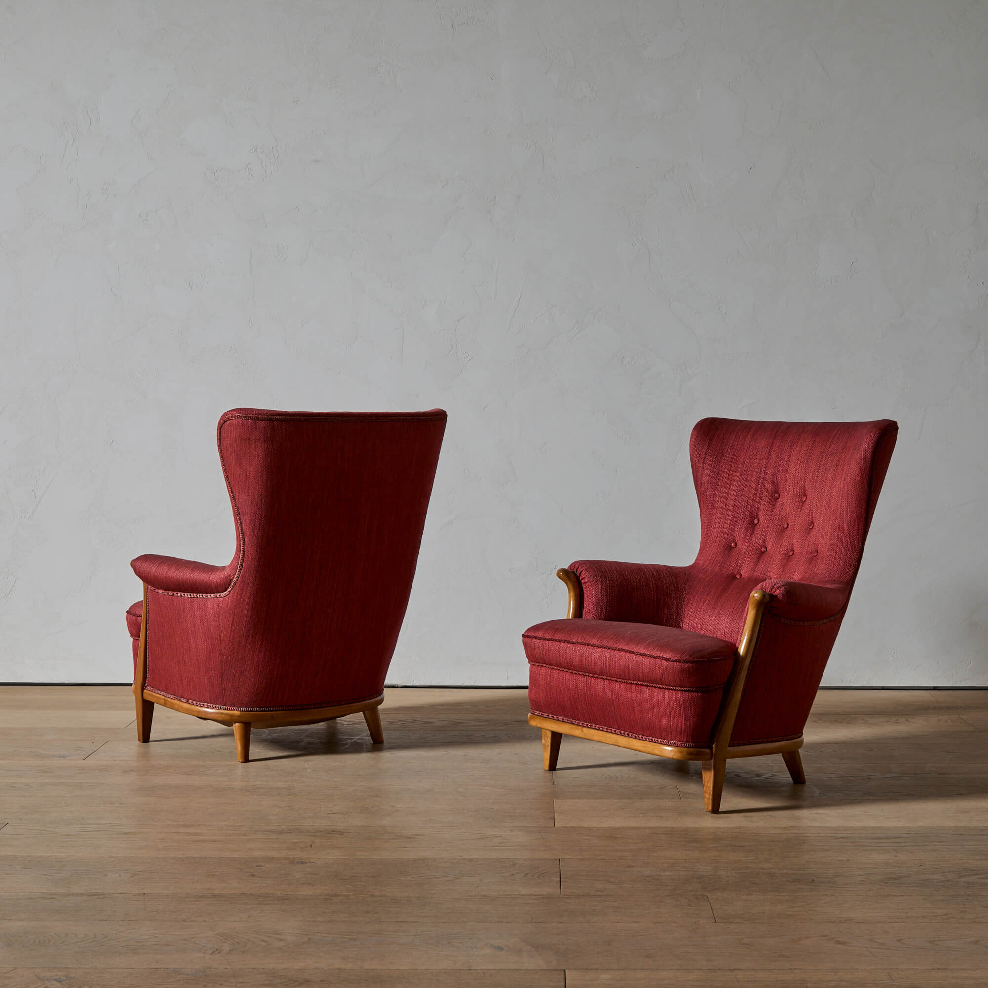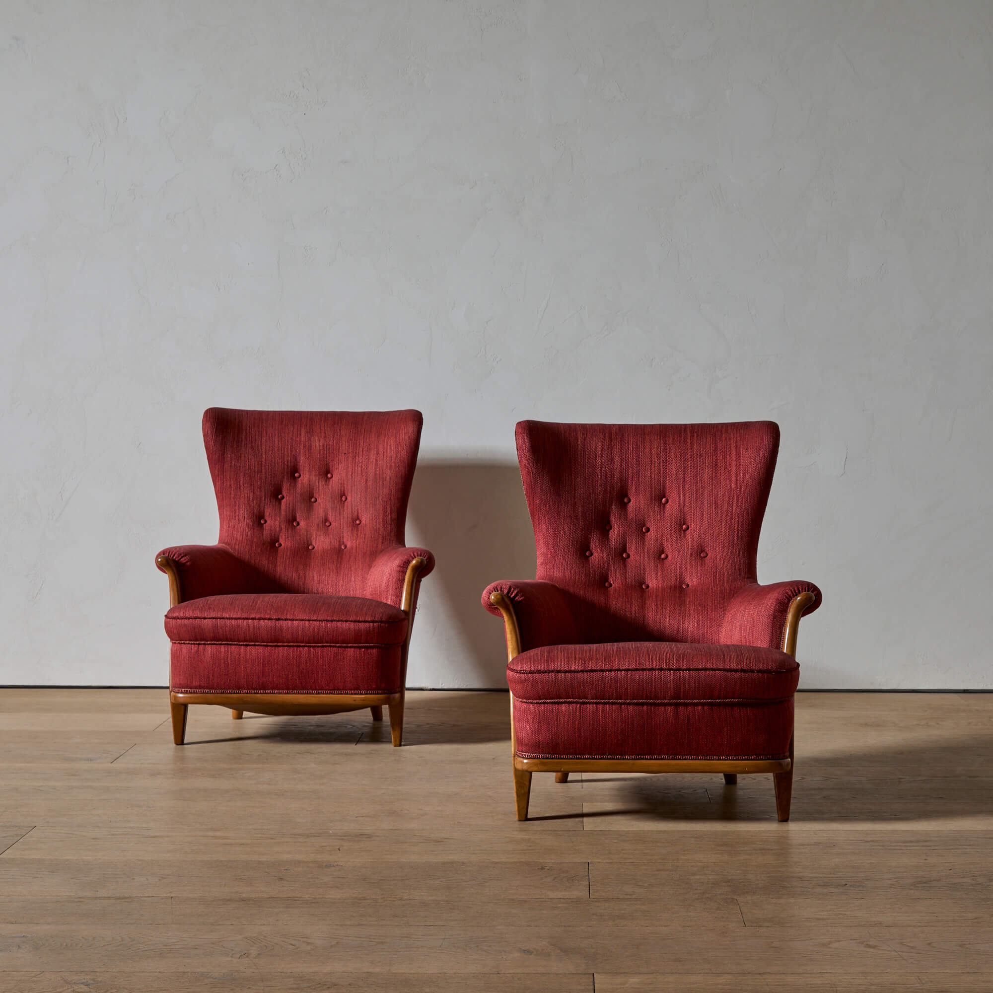 They are photographed in their original red woolen upholstery–see the last photo for an image of them reupholstered in a glazed linen. We are happy to sell them as is, or to supervise their reupholstery with your fabric.