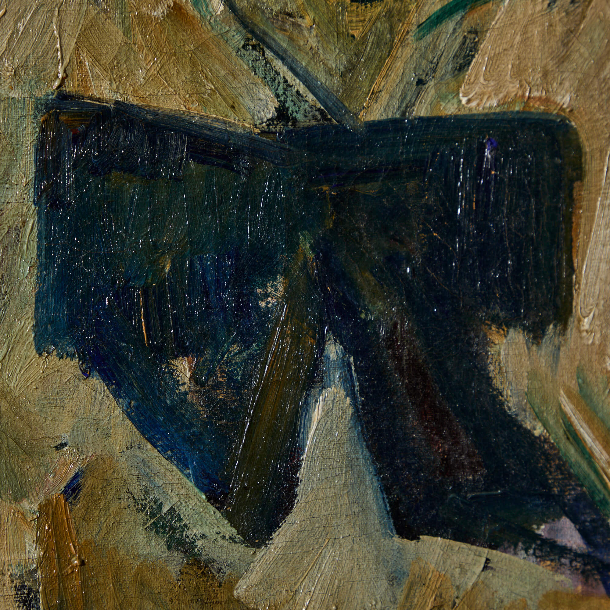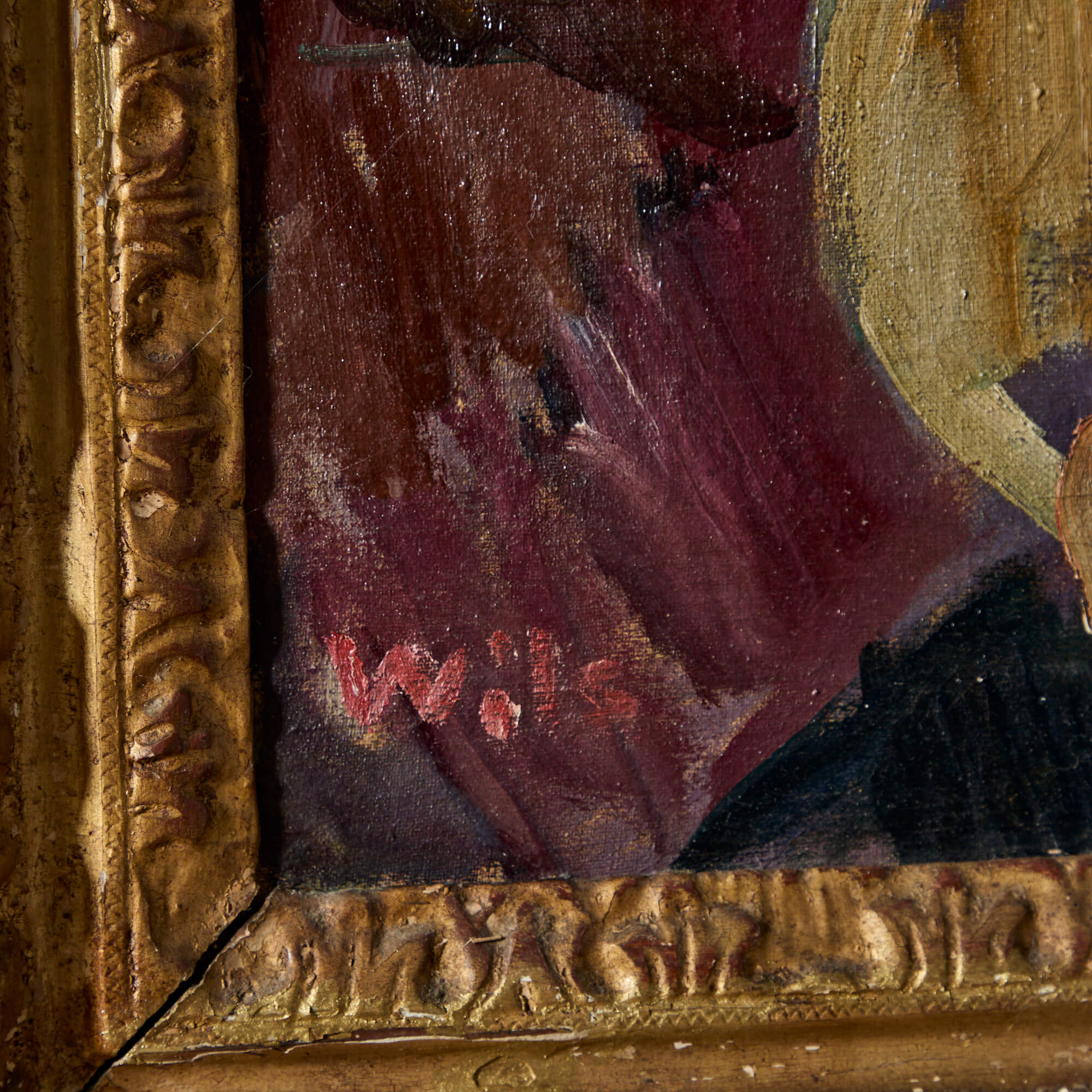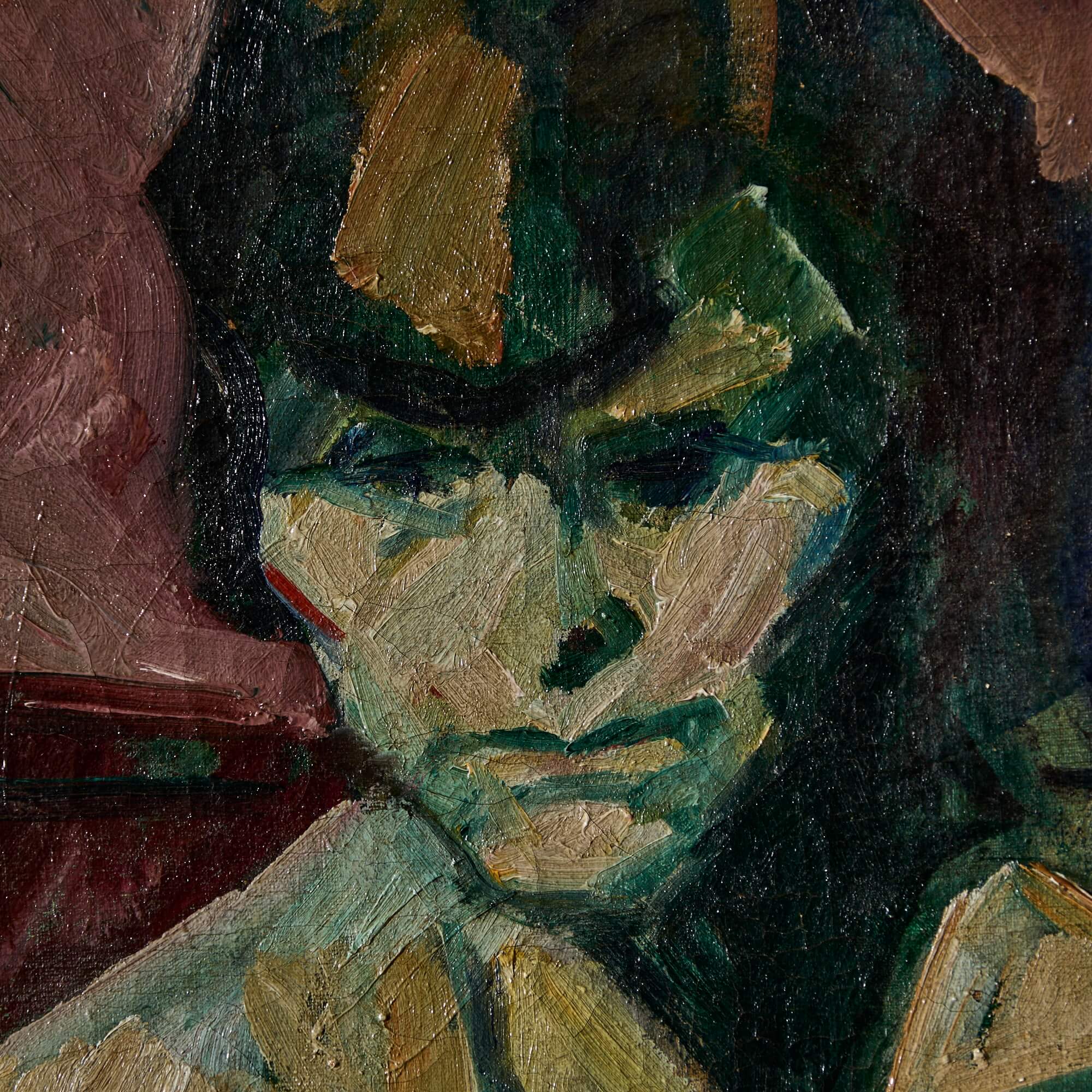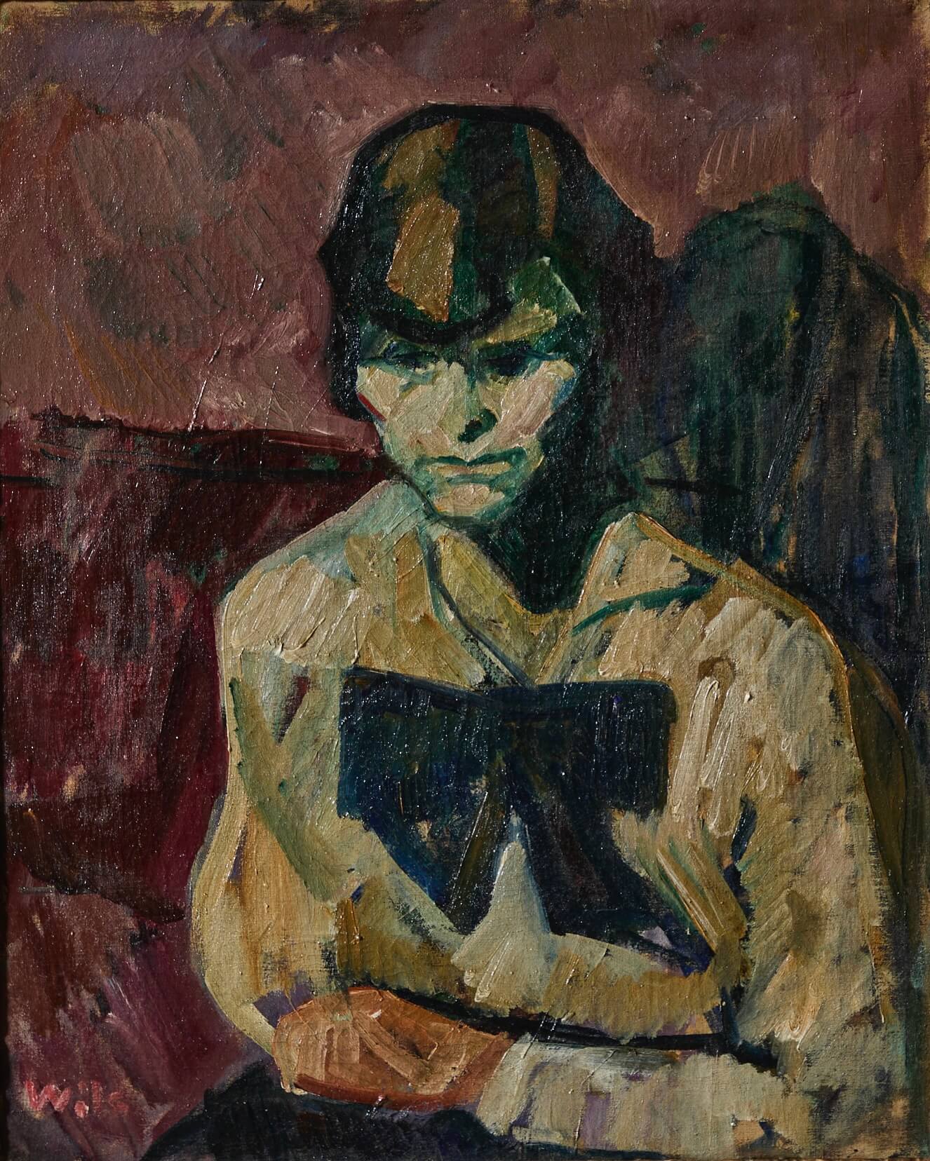 During the first decade of the 20th Century, after exploring photography, Wilhelm Julien Wils studied painting under Frede Aamodt and Kristian Zahrtmann in Denmark. At this time, he was exposed to the works of Toulouse-Lautrec and Edvard Munch. Lautrec was a particular inspiration to Wils. Like the French painter, Wils was interested in class structure and he often depicted night cafés, theaters, and Copenhagen street scenes. He is also known for his portraiture, such as this painting of a woman dressed in a fanciful bow, in vivid tones of pink and blue.