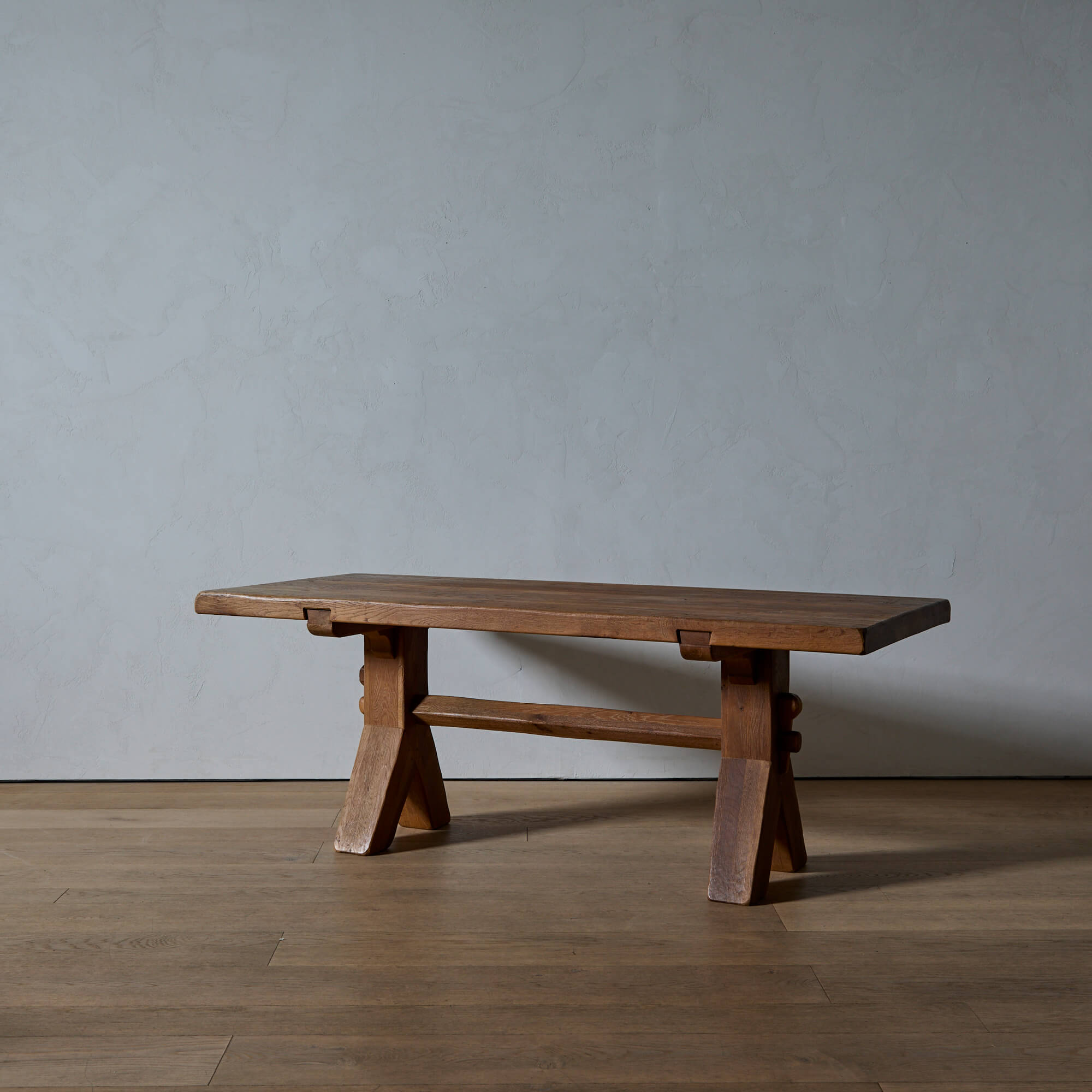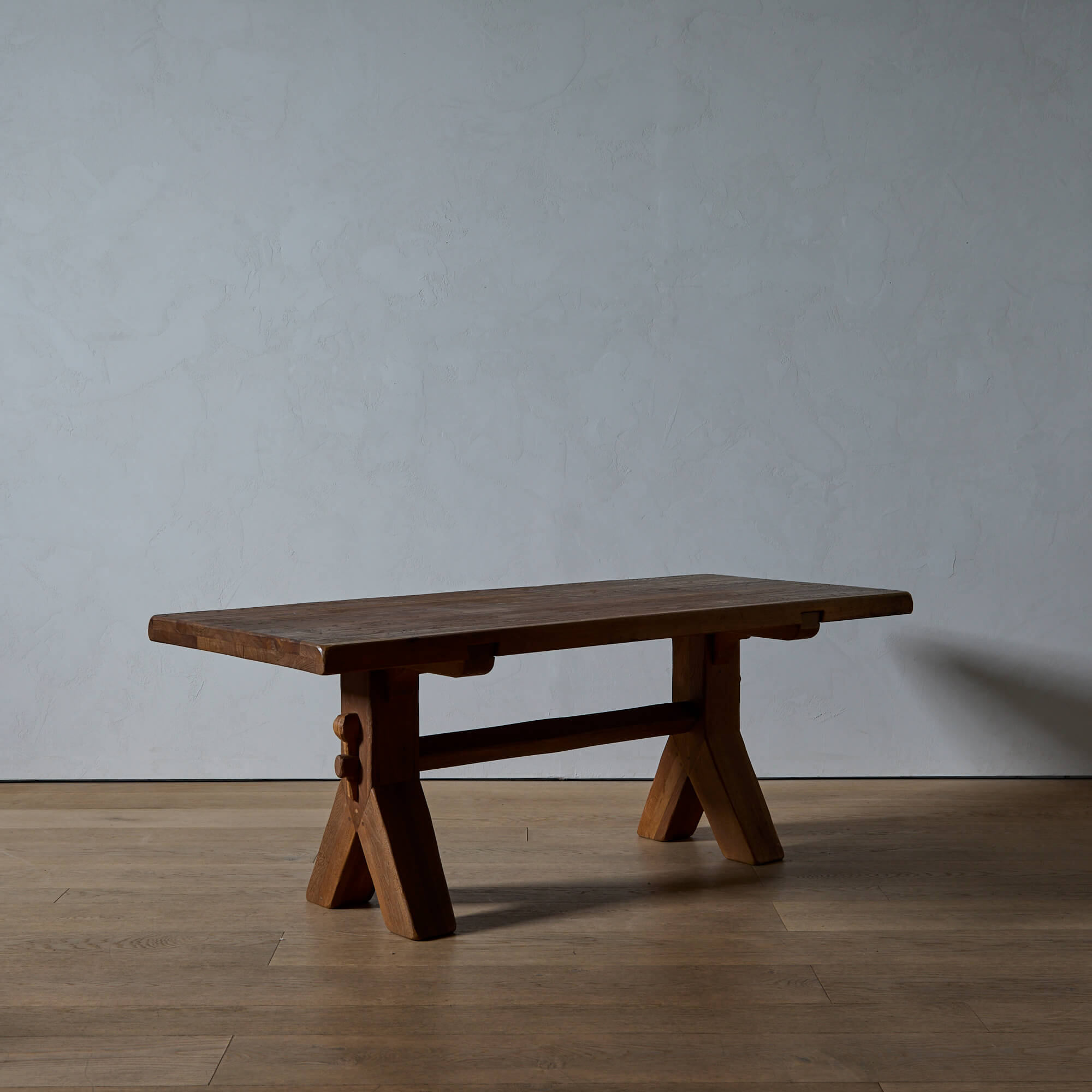 Influenced by the Brutalist movement, Belgian furniture maker De Puydt designed hand-carved furniture of substantial solid oak. The honest construction of this deceptively simple table, with its chiseled top and trestle base, is highlighted by the beauty of its joinery.