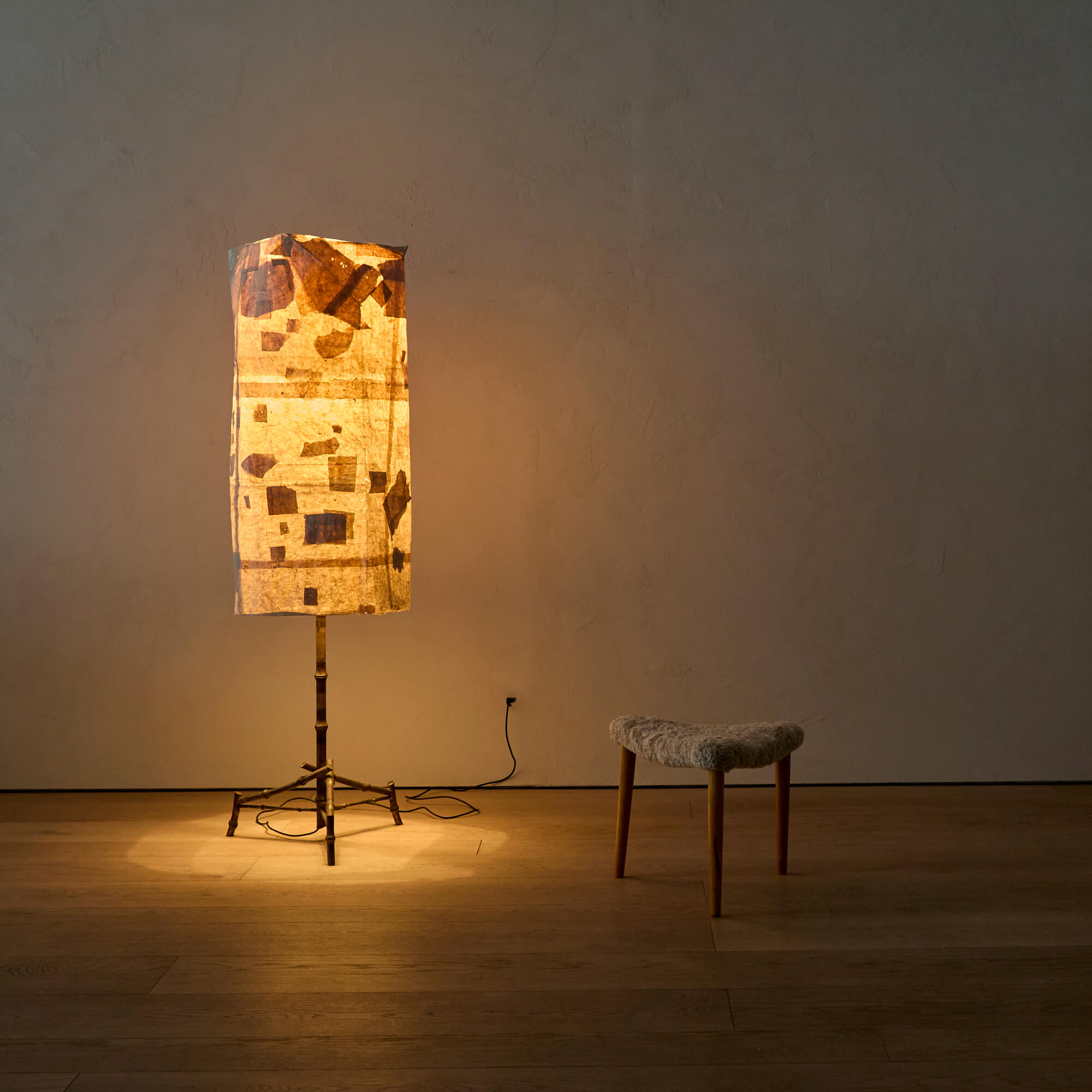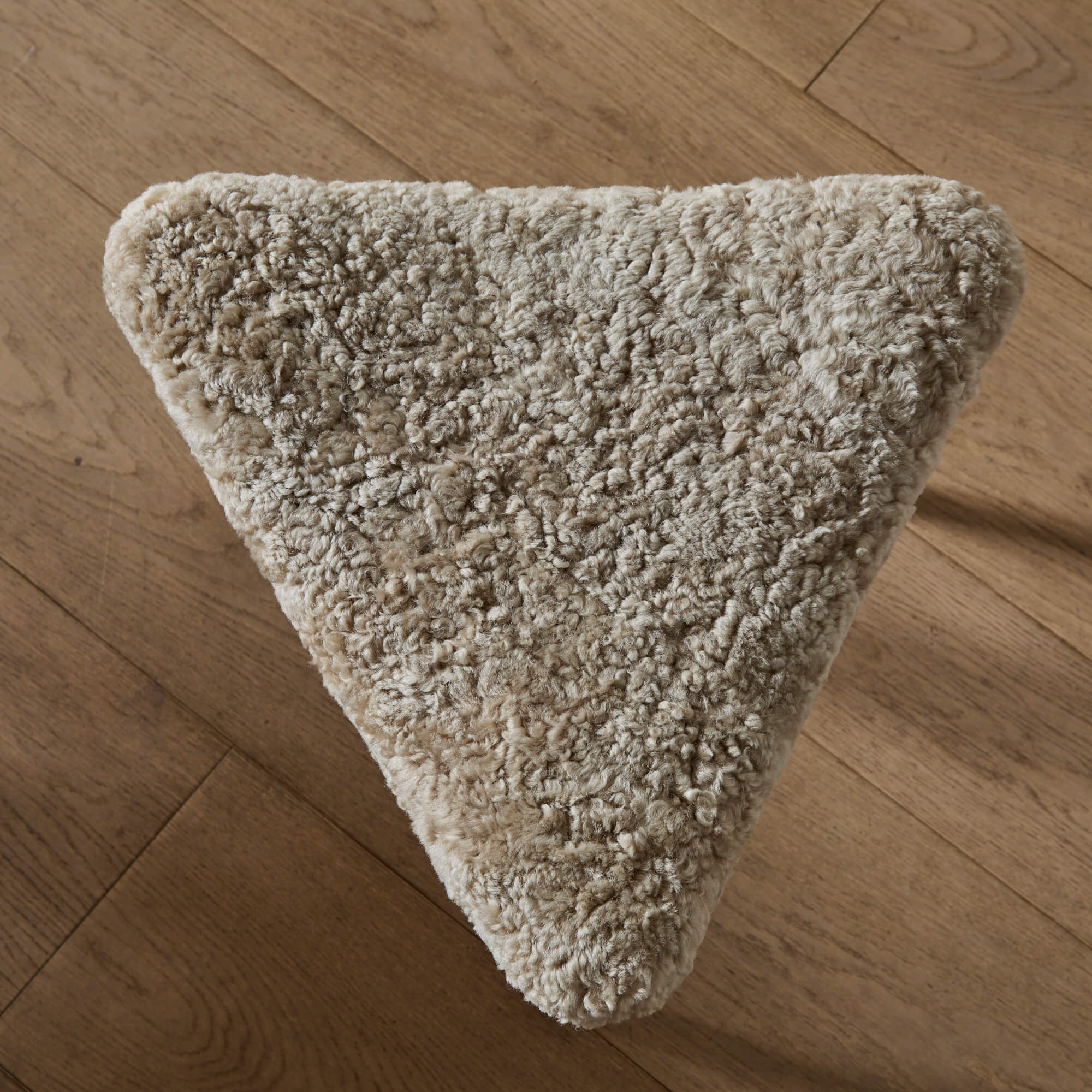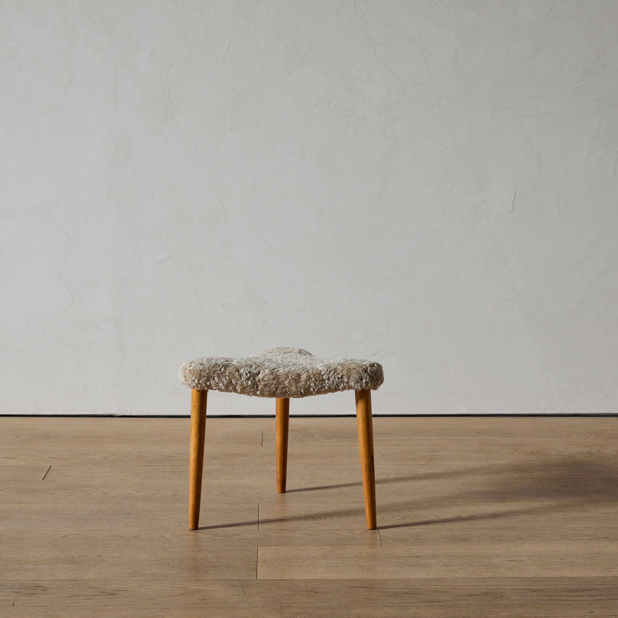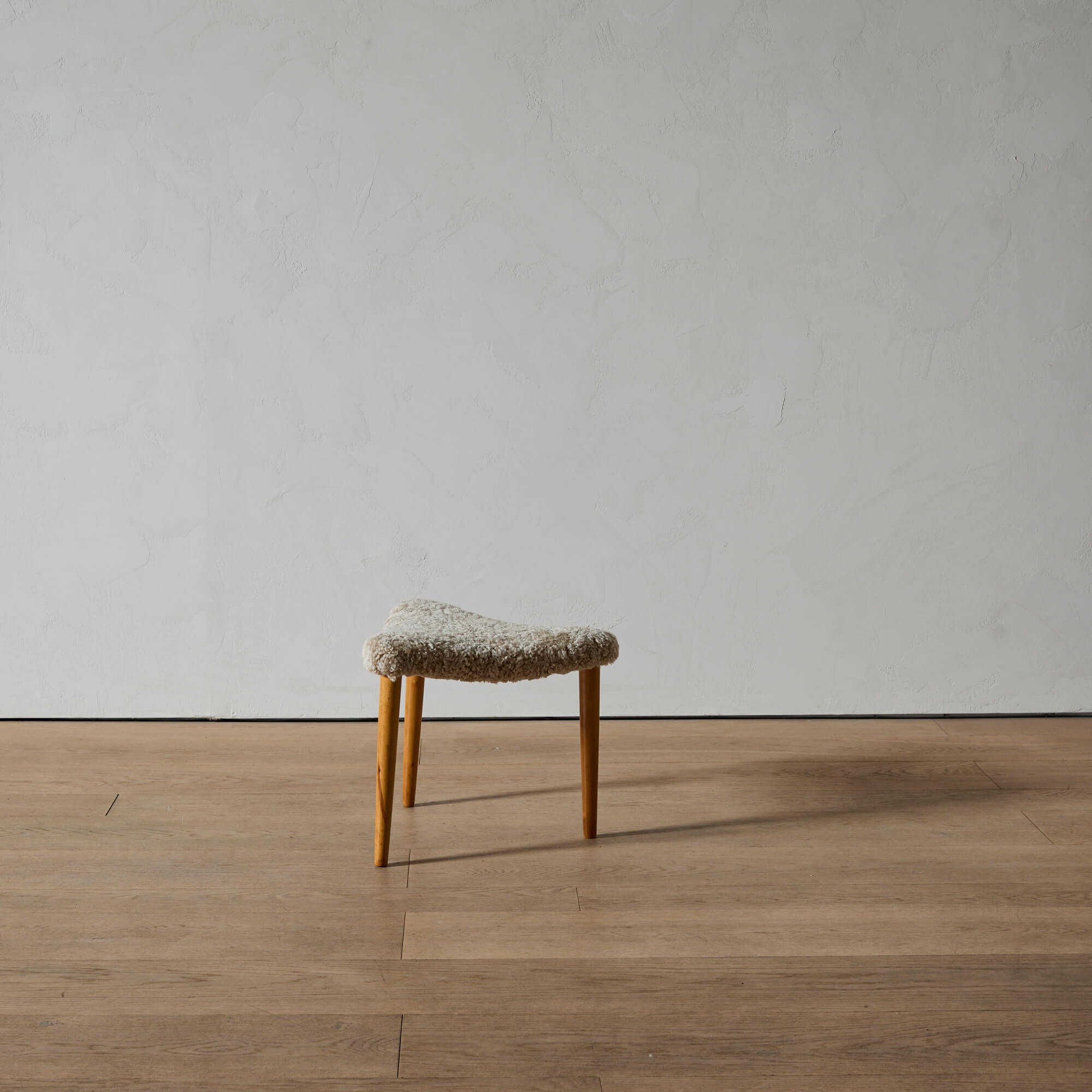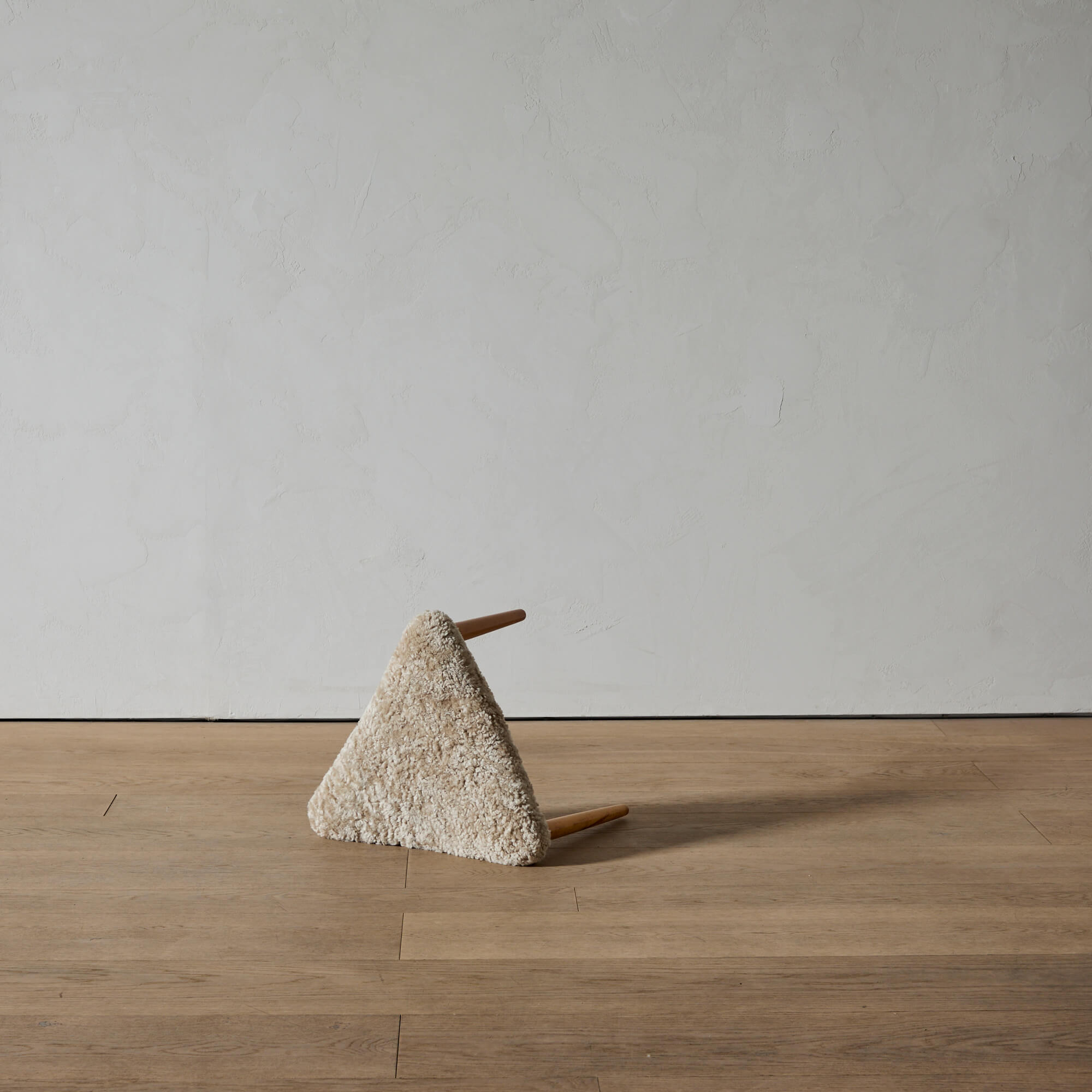 A triangular birch stool with subtly tapered legs, a gently dipped seat recovered in soft, curly sheepskin. Quite a comfortable perch for its economical size. Tucks easily under most tables.