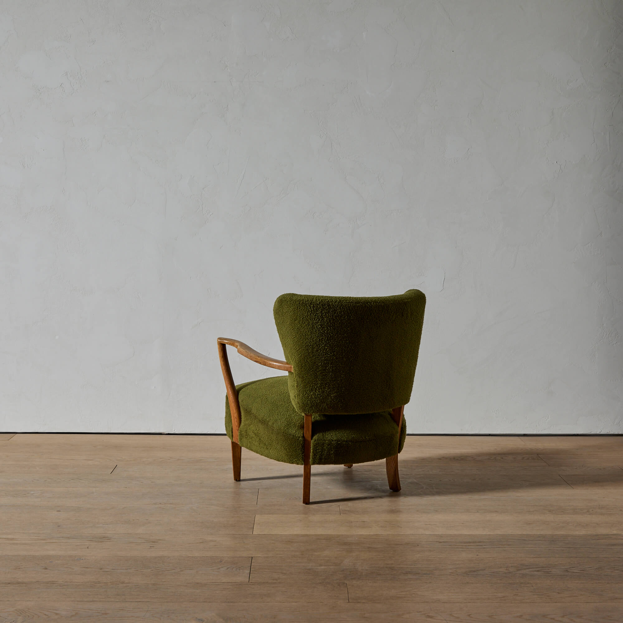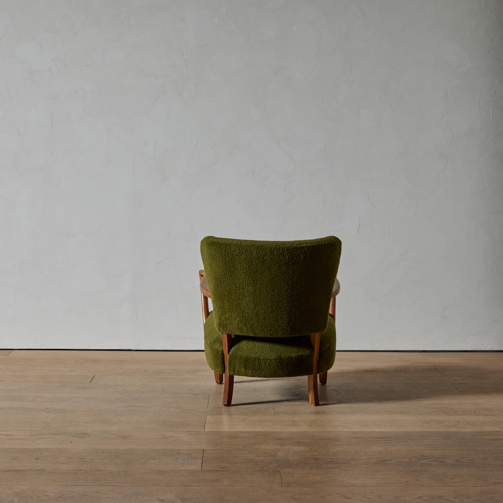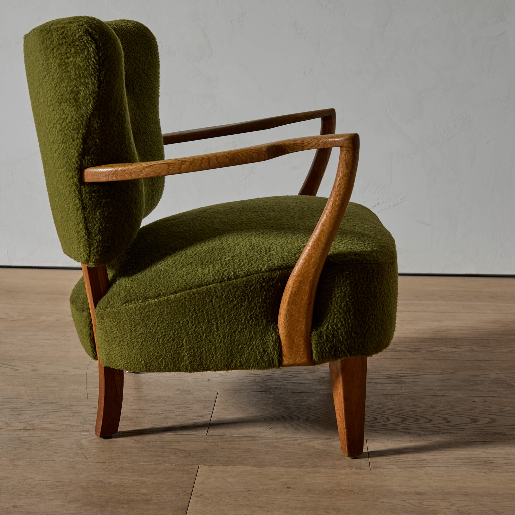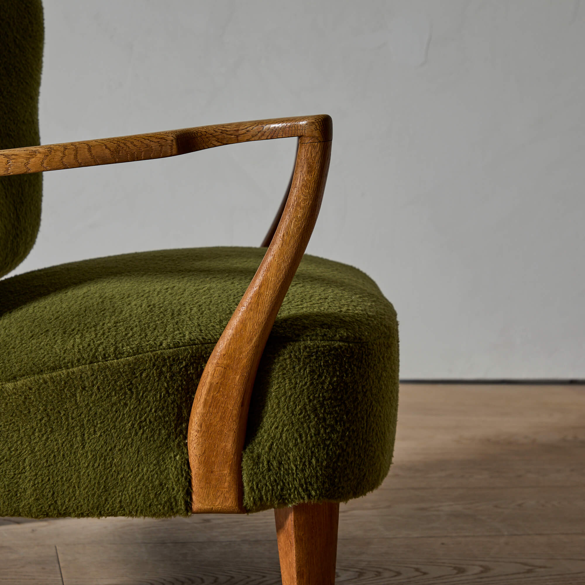 The exposed, carved oak frame, the gently embracing curves, the spaciousness created by the separated back and seat, and the quality of craftsmanship of this chair all point to Schulz.